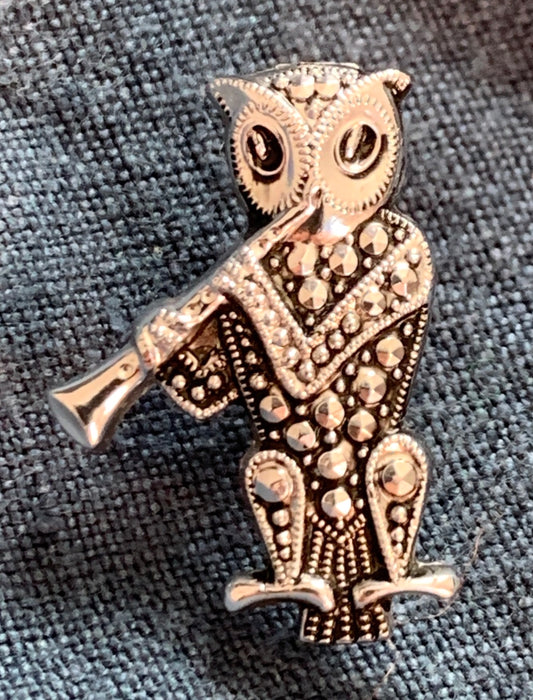 1940s Little Clarinet Playing Owl Faux Marcasite Brooch - 2.3cm Tall