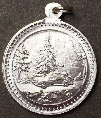 One side has a classic St Christopher image, the other side is gorgeous - a big 1940s car motoring along a remote forest road - Well Protected...