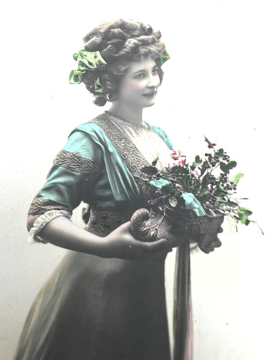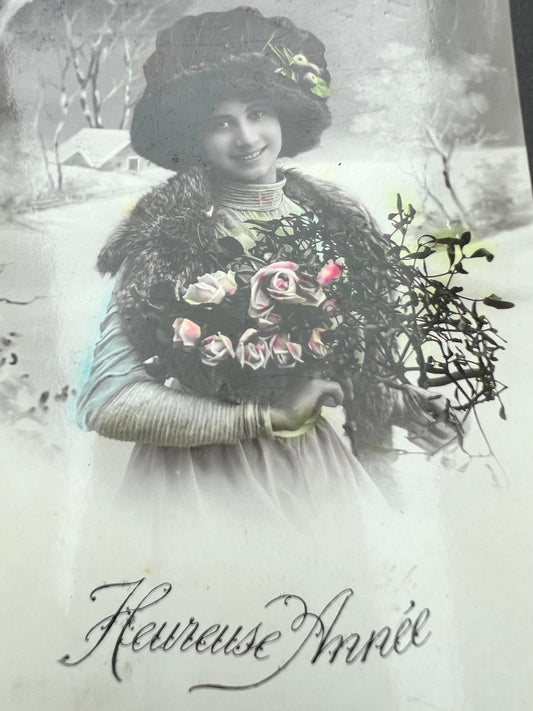 Splendid Hat, Snow & Mistletoe on this 1900s French Christmas Postcard.