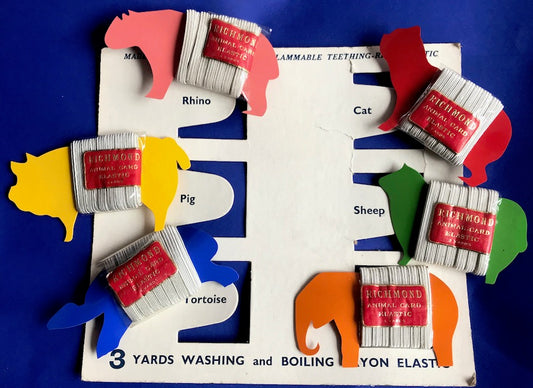 1940s Rayon Elastic on "Non-Inflammable" plastic animal holders Made in England