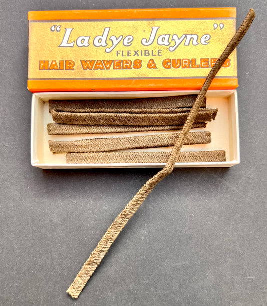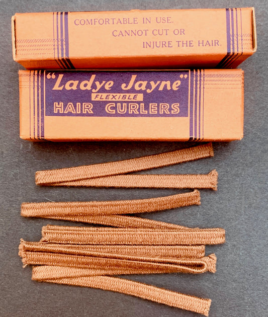 1930s Box of 6" long FLEXIBLE "Ladye Jayne" fabric covered Hair Curlers