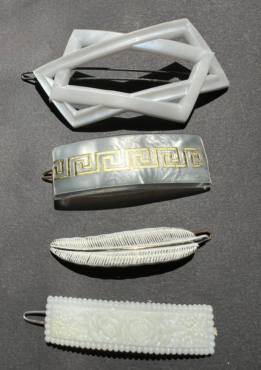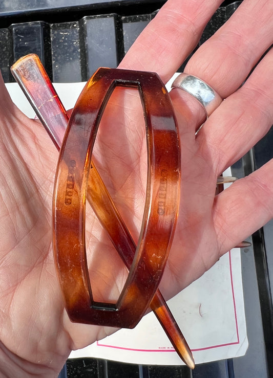A Vintage 1950s French Sheet of 6 Amber Plastic Hair Barrettes