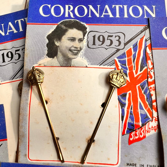 10 Genuine (slightly grubby) 1953 Queen Elizabeth 11 CORONATION Hair Pins with CROWNS