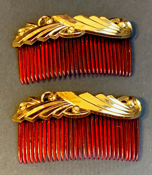 Dramatic 1940s Tortoiseshell and Gold Hair Combs - 8cm wide