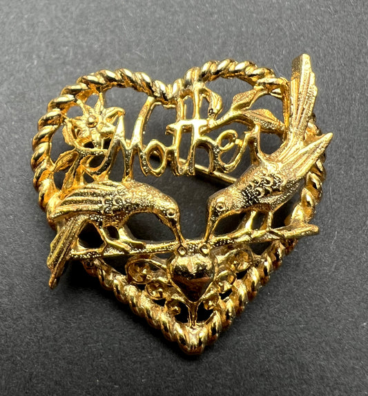 Golden Birds on Heart Shaped Vintage MOTHER Brooch