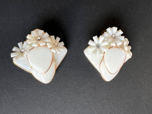 Mid Century Diamante and White Flower Vintage Clip-on Earrings
