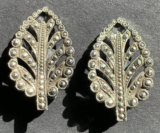 Lovely Vintage Faux Marcasite Leaf Clip On Earrings