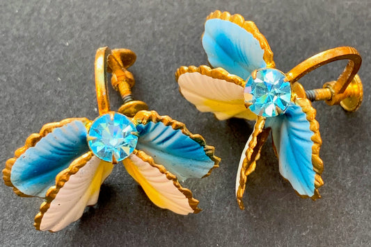 Delicate Vintage Austrian Crystal Blue and Yellow Clip-On Earrings