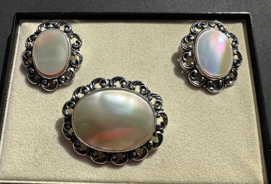 Shimmery Mother of Pearl Vintage Brooch and Clip-On Earring Sets