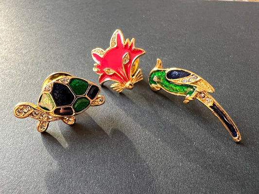 Enamel & Swarovski Crystal Decorated Little Vintage Pins Fox, Parrot or Tortoise