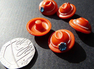 6 Jaunty Vintage Orange Hat Buttons with Blue Flower