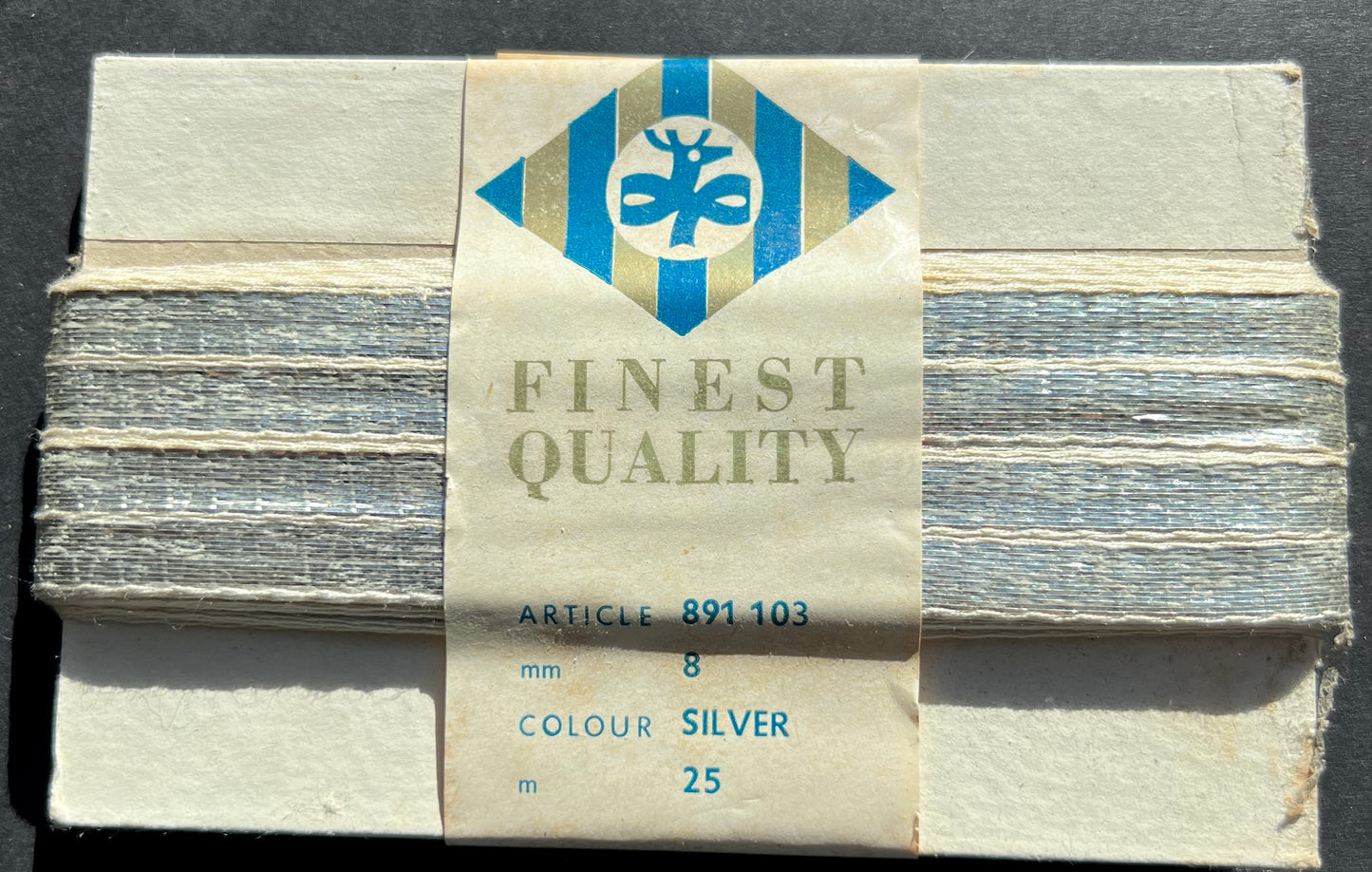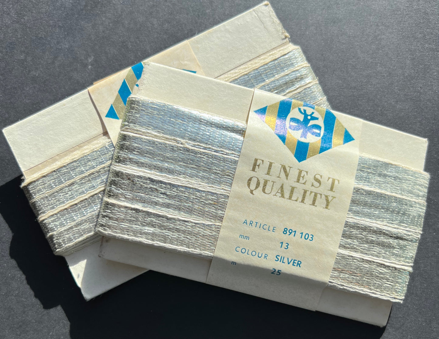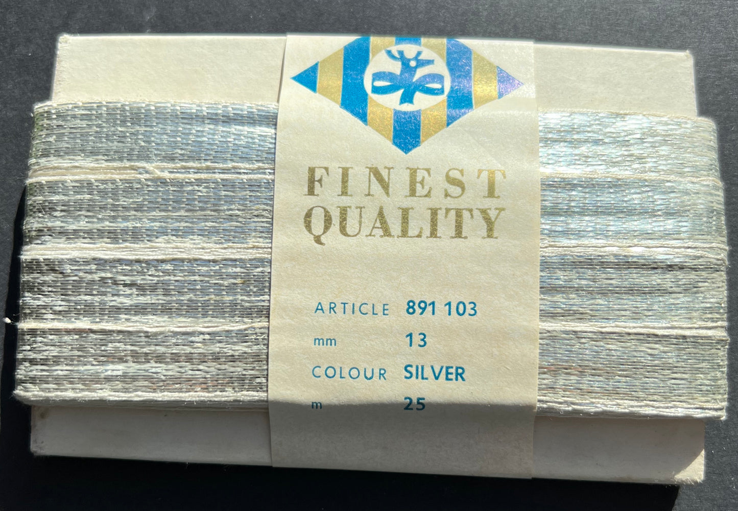 25m of 1.3cm or 8mm wide Shiny Vintage Silver Metal Ribbon 25m long. Made in Czechoslovakia.