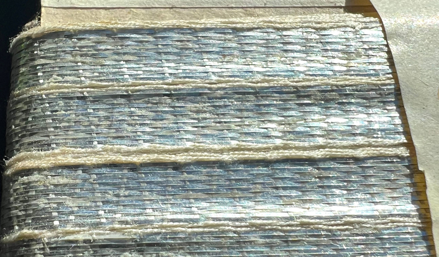 It seems to be made of strands of metallic cotton, reinforced with a faint zigzag stitch and edged with silver cotton.