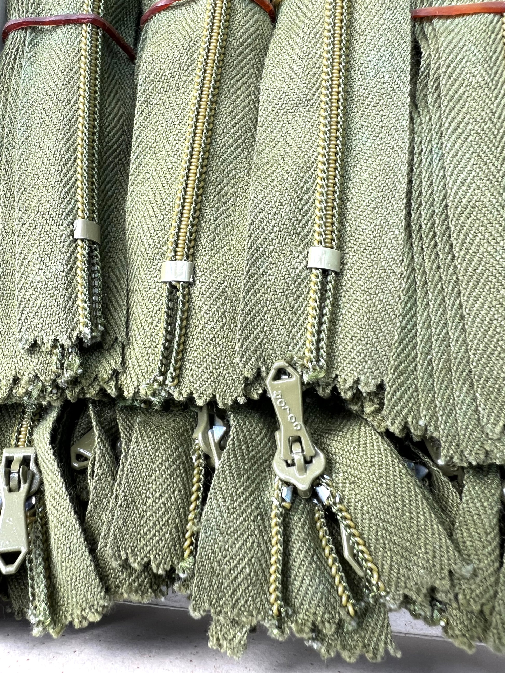 A box of 120 vintage sage green zips.