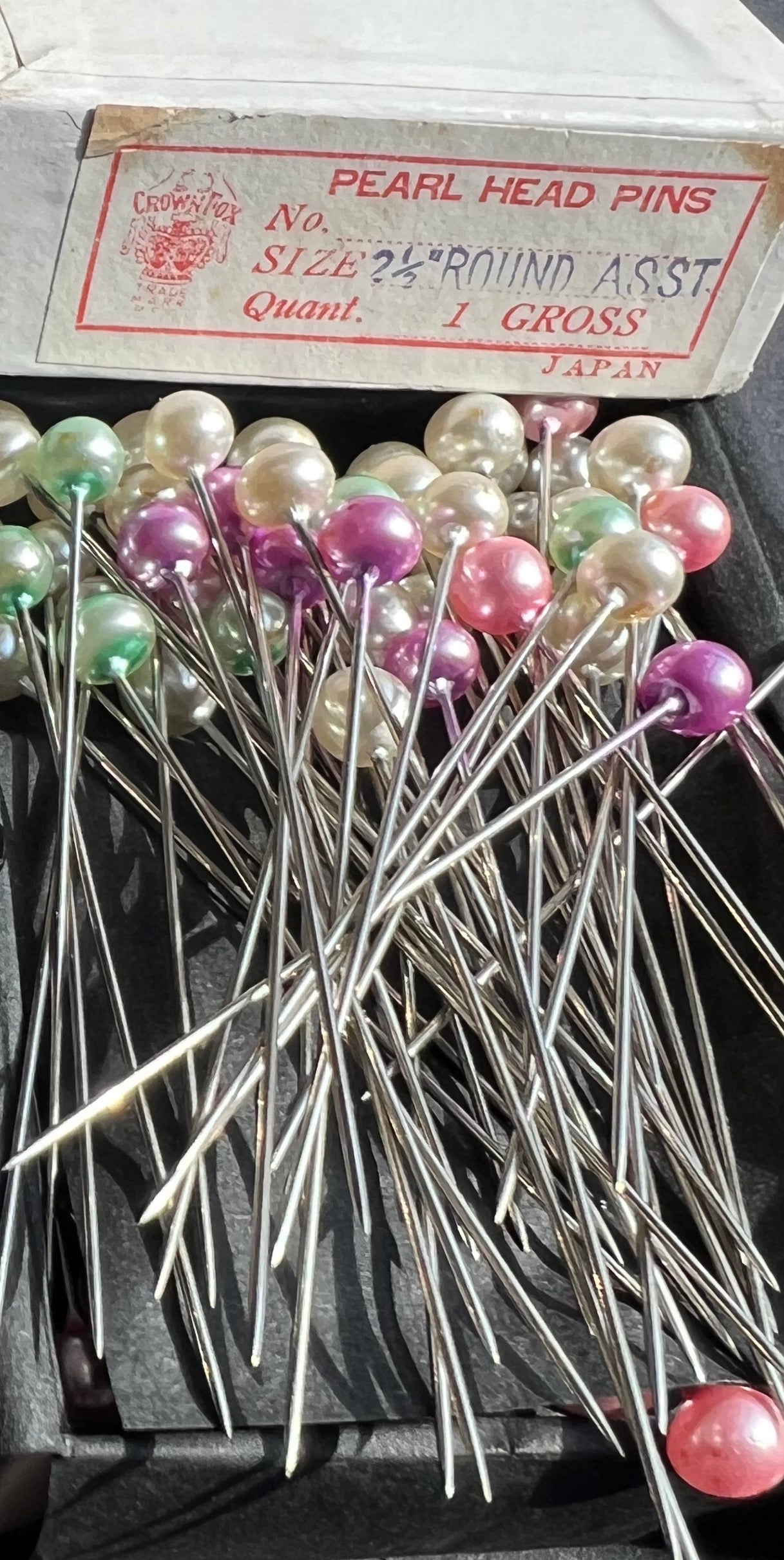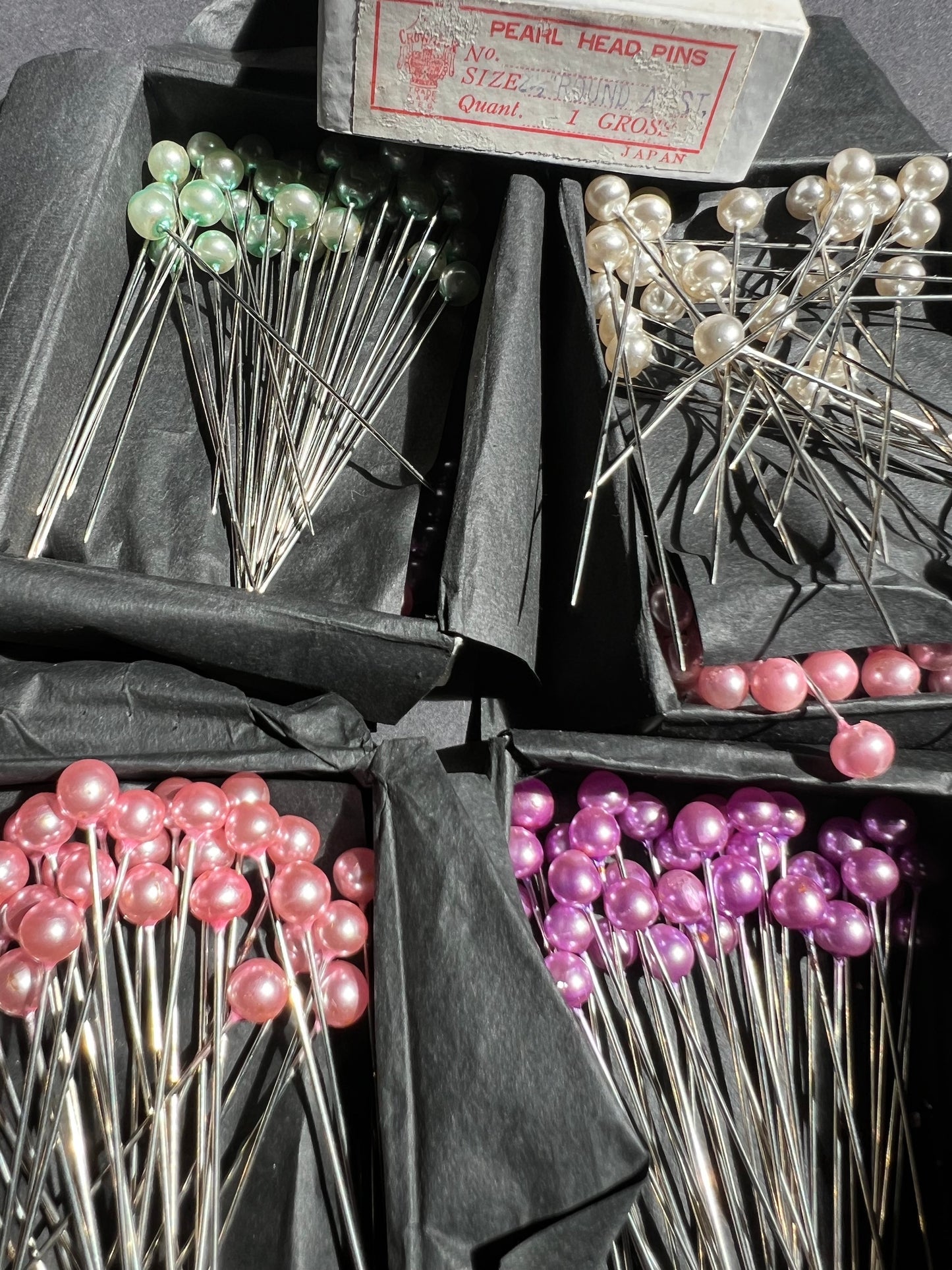 Made in Japan in the 1940s, there are either 108 or 144 pearl head pins in each