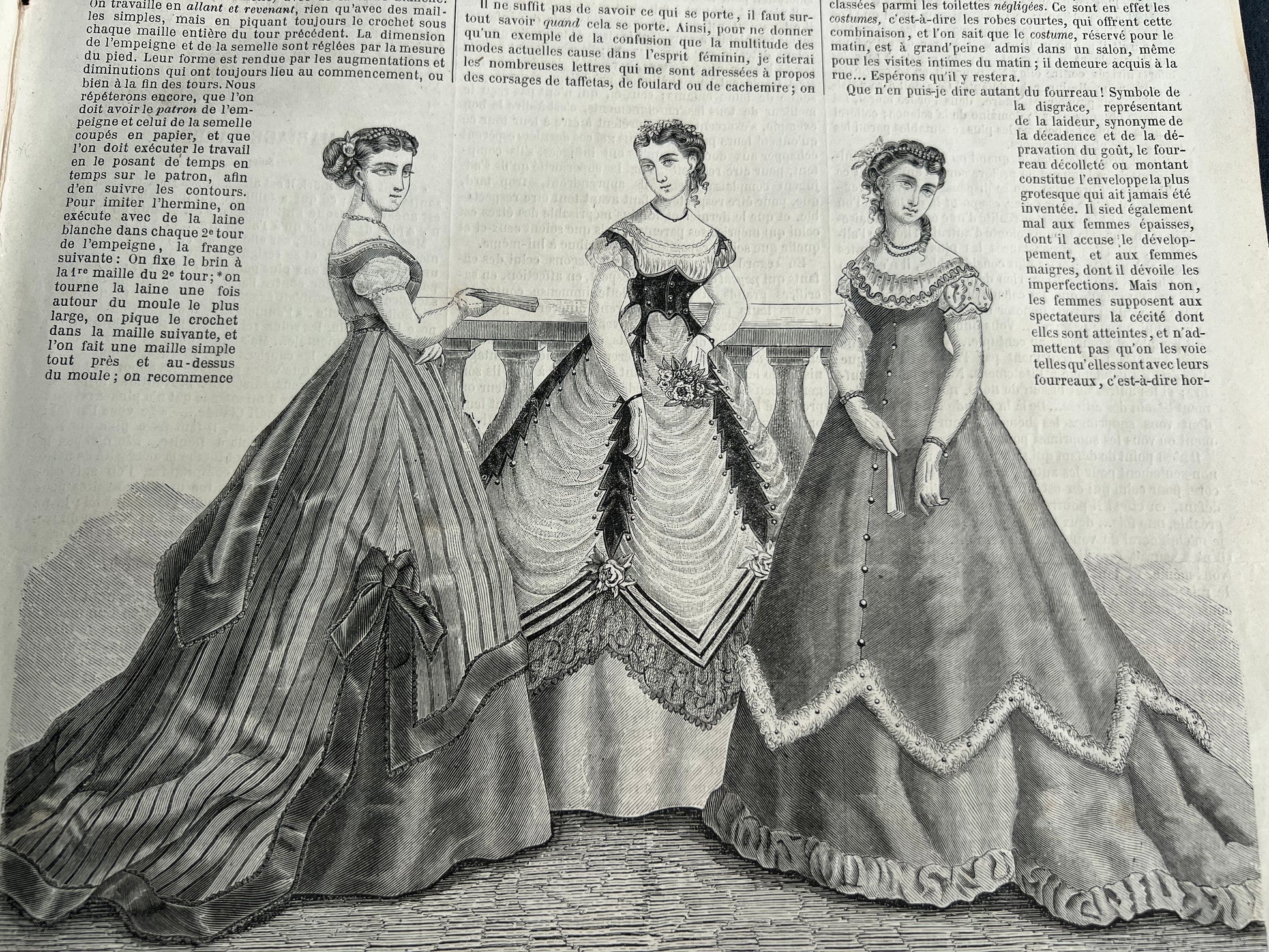This 20th January 1867 issue of the French Fashion paper La Mode Illustree contains 8 big - 26cm x 36cm - black and white pages and is in good condition, just has a rough spine as these would have been sewn, at one point, into a big hardback folder containing a years worth of papers.