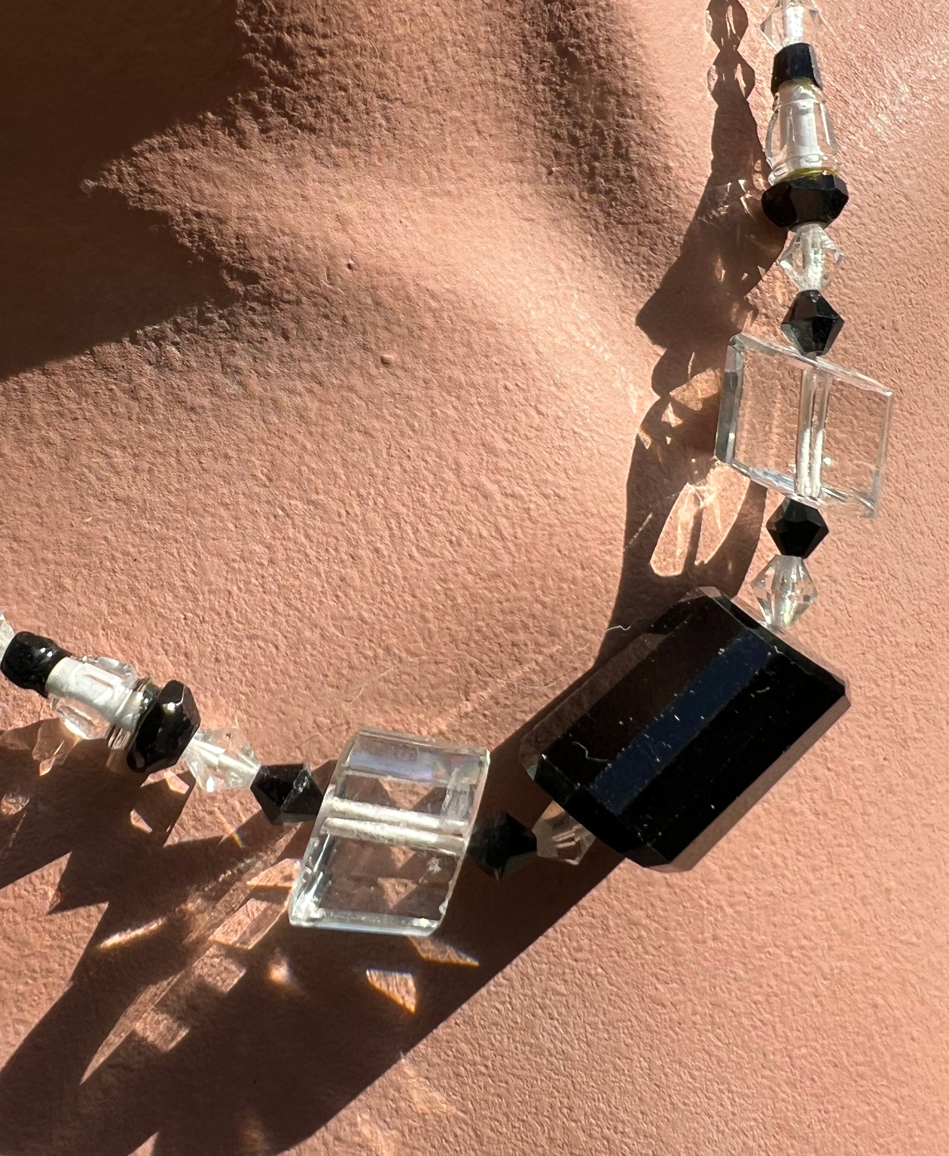 Impressive Czech Faceted Black and Clear Crystal Necklace 16"/40cm