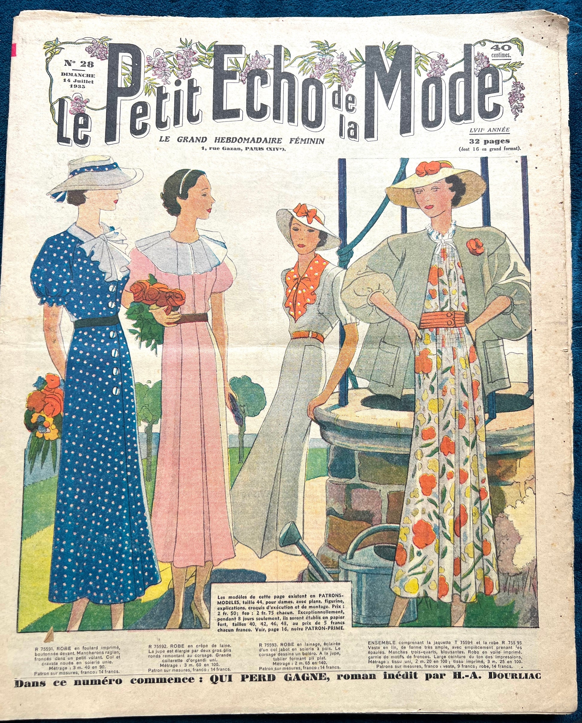 The most fashionable summer dresses on the front cover of this 14th July 1935 issue of the French Fashion Paper Le Petit Echo de la Mode.