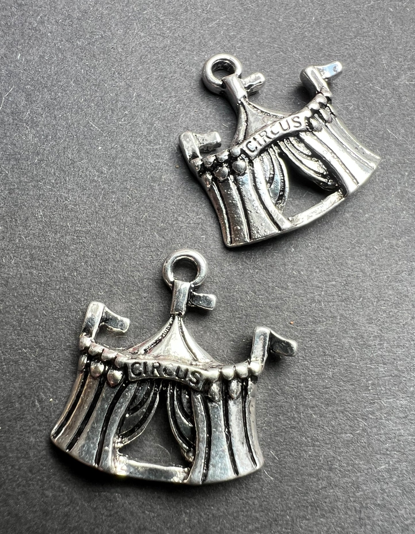 A charm in the shape of an old fashioned circus tent - 2.2cm tall including loop at top - made of a silver tone metal.