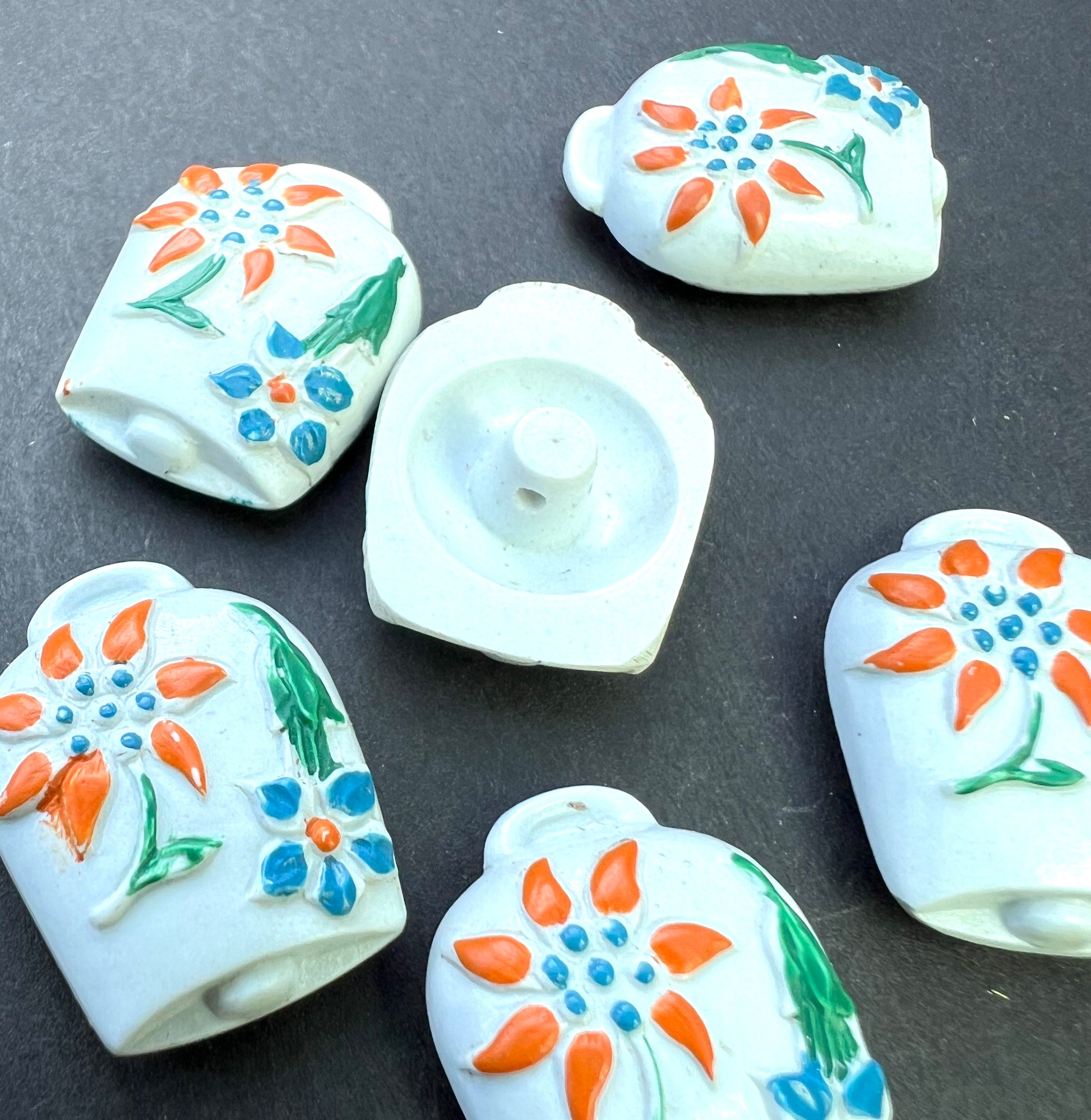 Charming vintage buttons in the shape of cowbells, white with red and blue flowers.