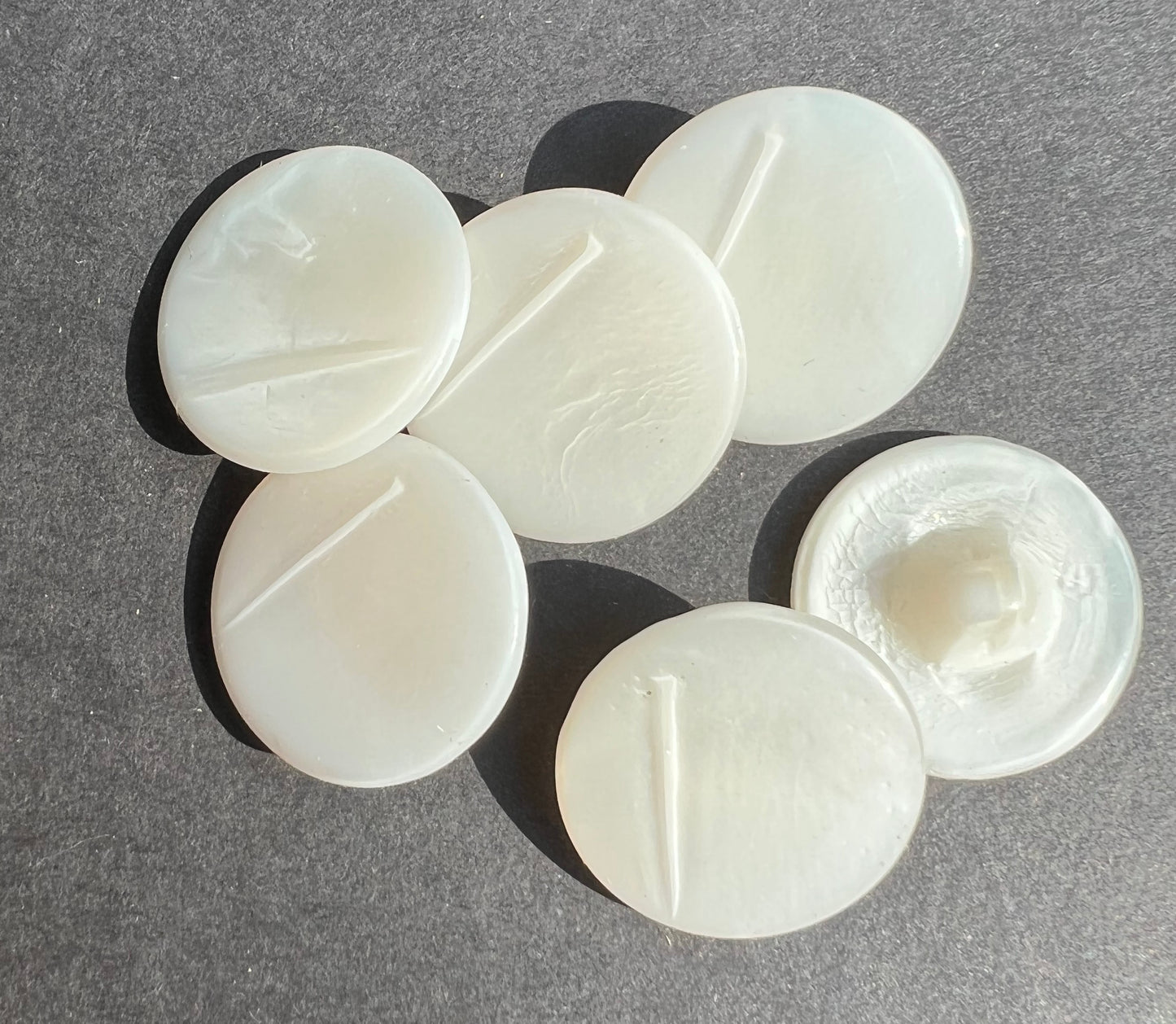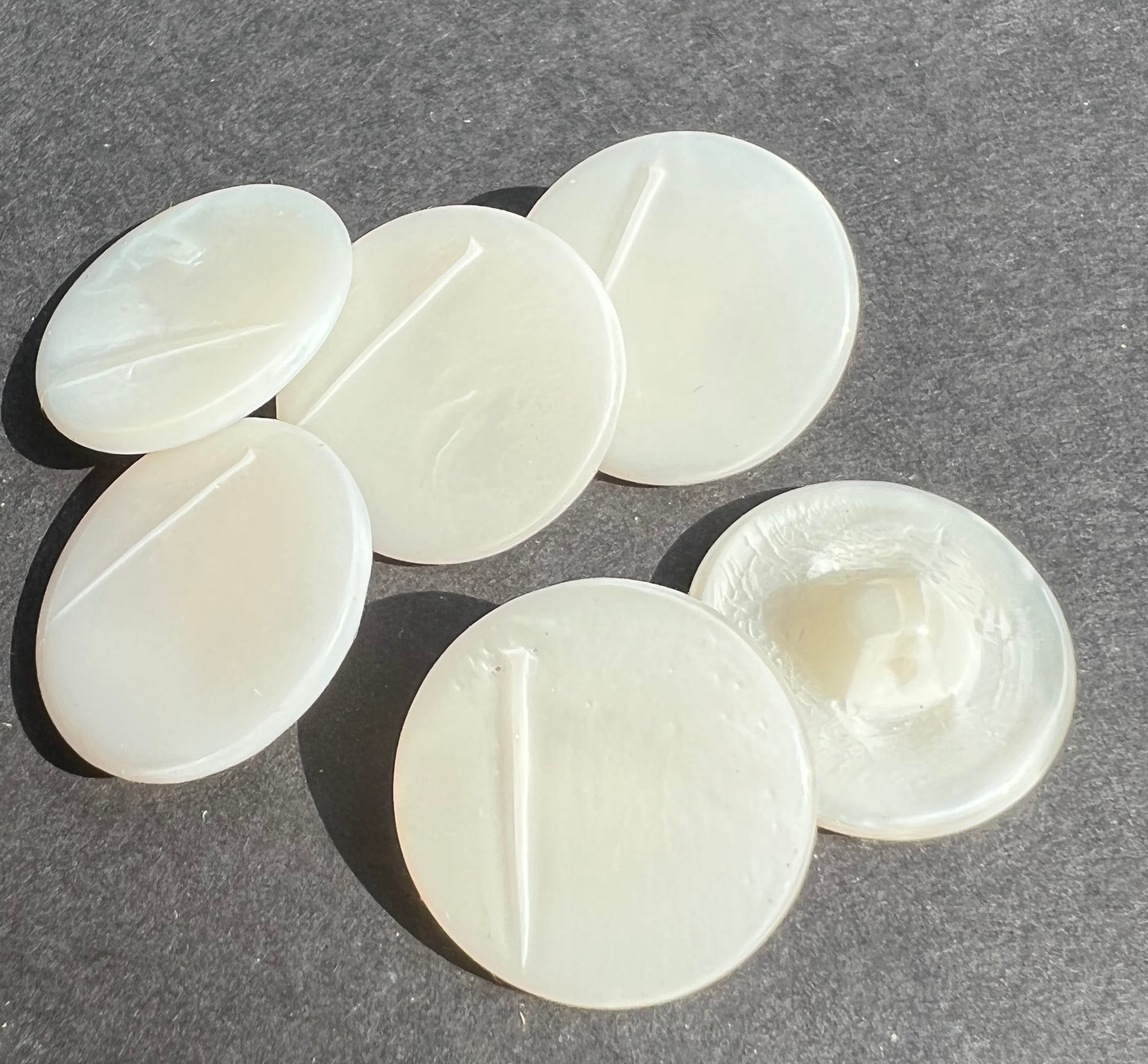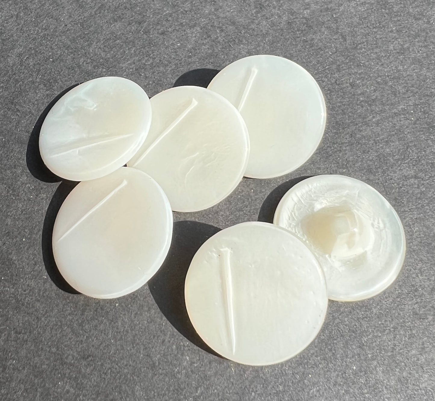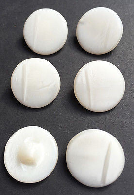 6 vintage white glass buttons - a kind of textured pearly white- shimmery and with an off centre line down one side with a shadow effect - rather interesting.