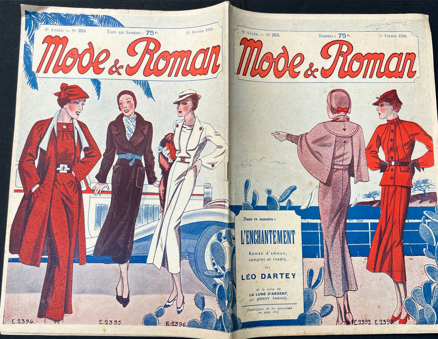Elegant coats in which to arrive and depart on the front and back cover of the 15th February 1936 issue of the French women's magazine Mode & Roman.