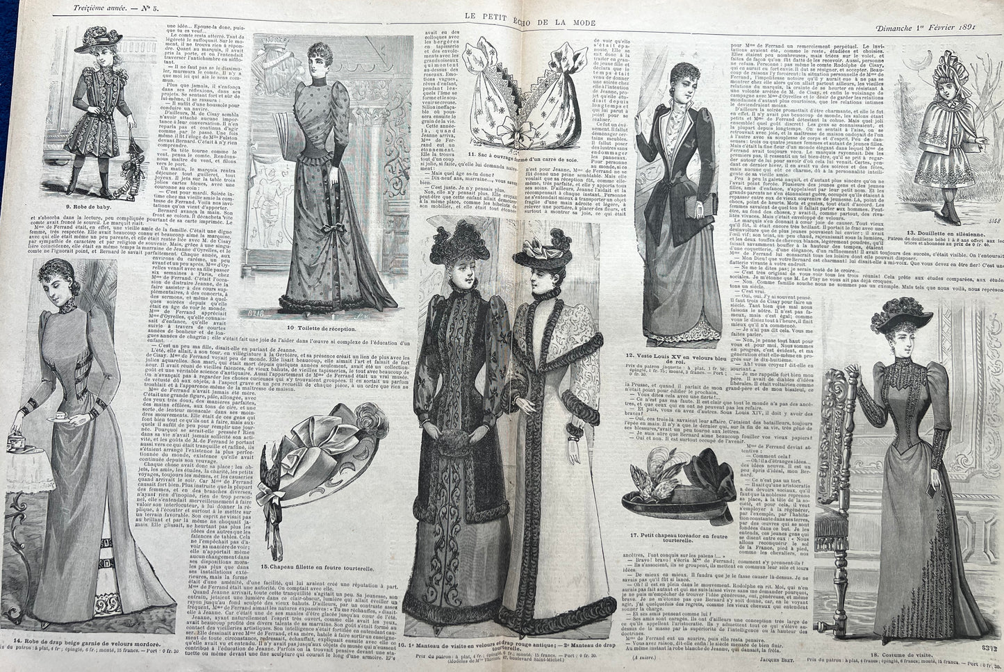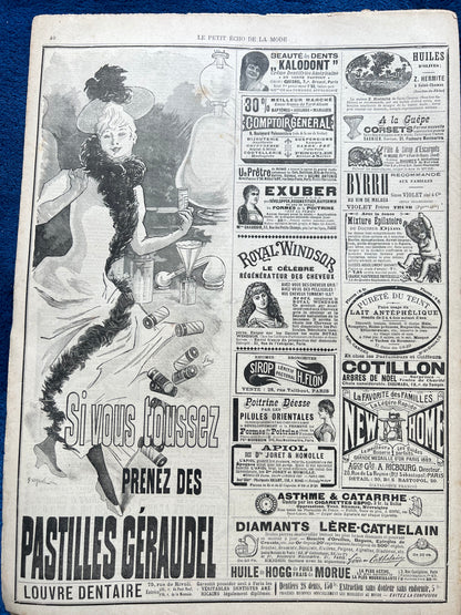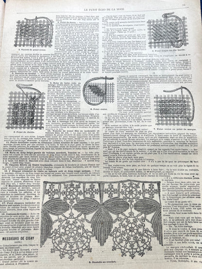 1st February 1891 issue of the French Fashion Paper Le Petit Echo de la Mode - 8 black and white pages of womens fashion illustrations, crafts, hats, news, advice and 1900s adverts.