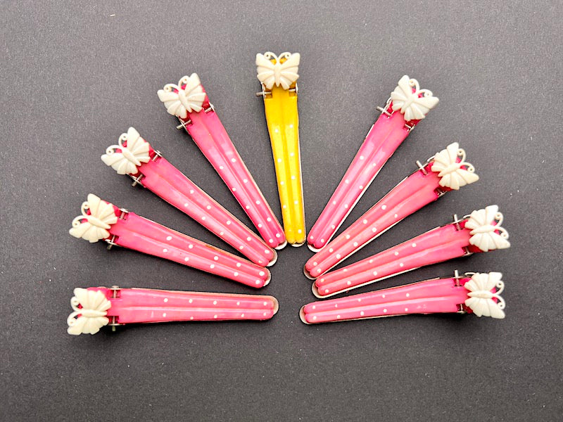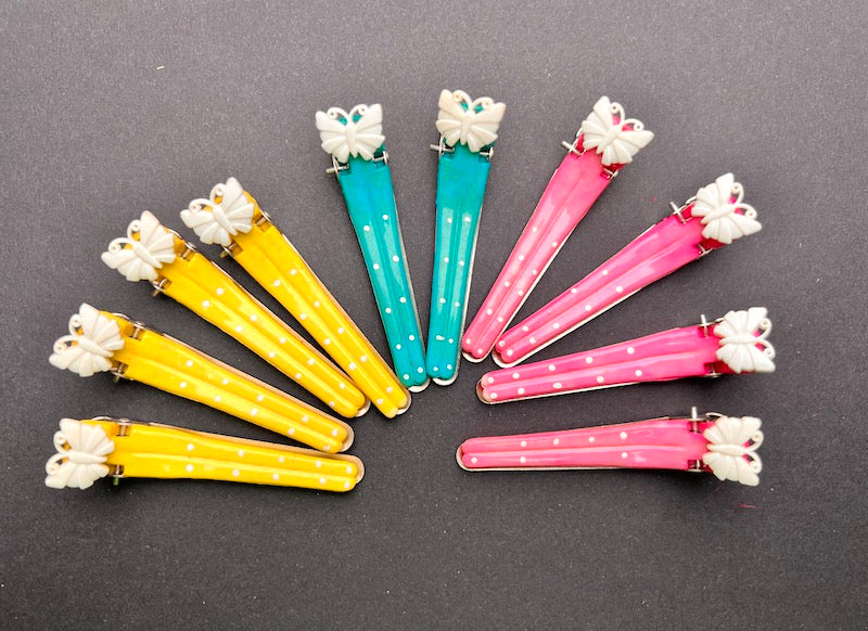 Big strong clips - brightly coloured, spotty and and with butterflies on the end