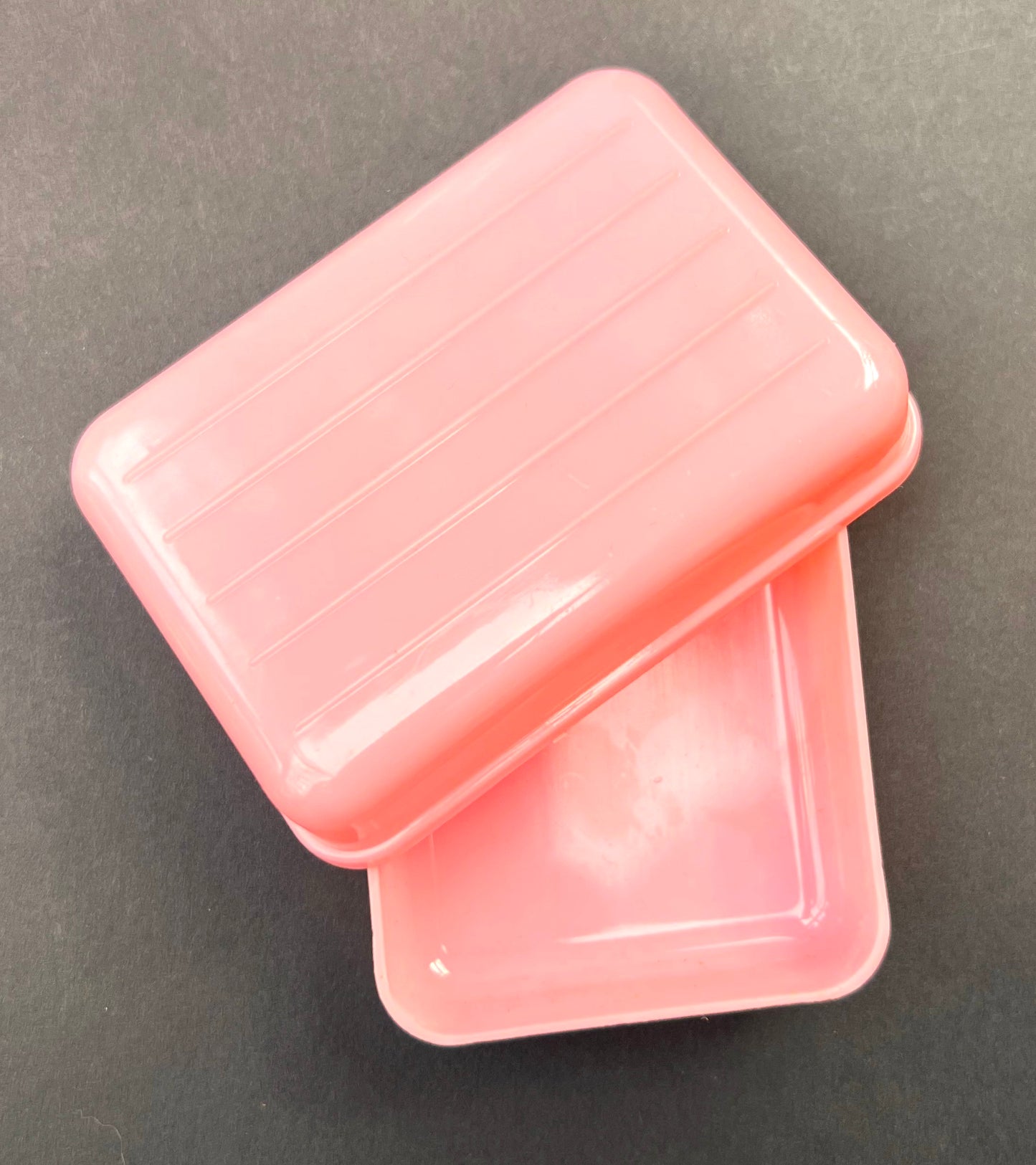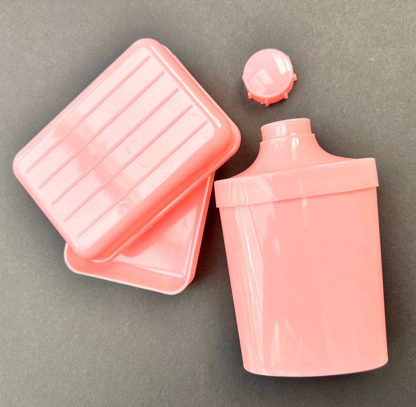 They contain a plastic soap dish and a plastic talcum powder bottle, with a removable top and a screw lid. Because of course one should NEVER leave home without talcum powder.