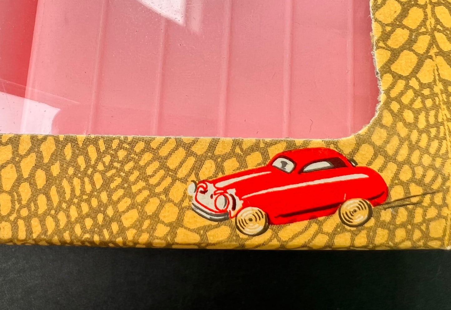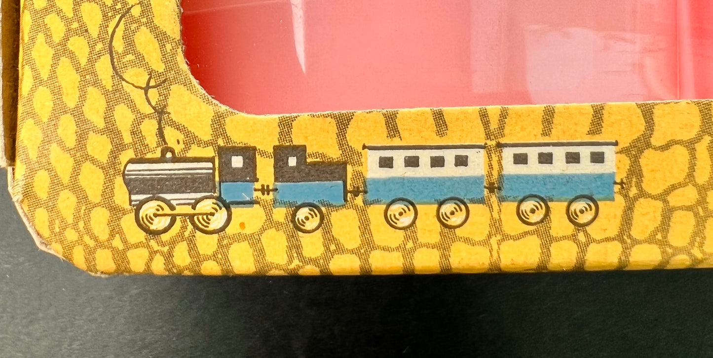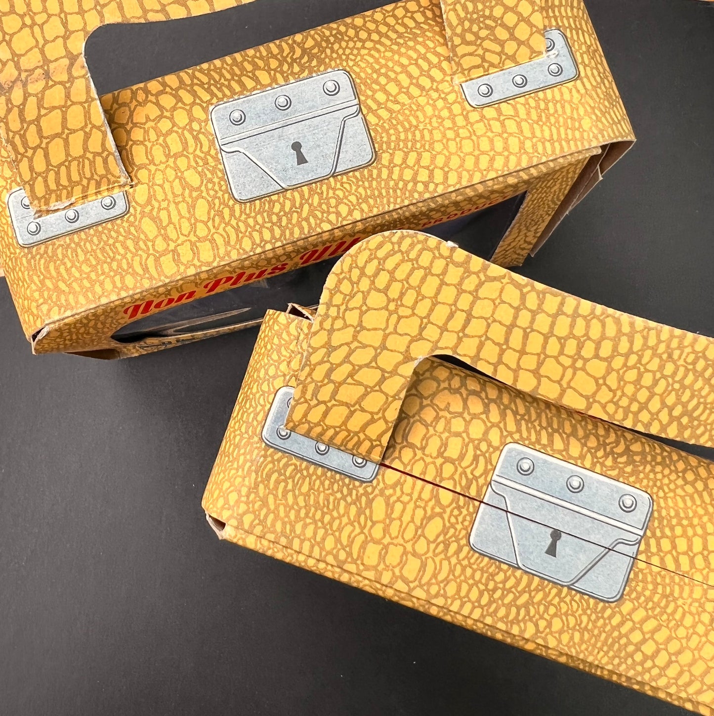 Little cardboard suitcases with cellophane sides, complete with pictures of a lock on the top and trains, cars and travel stickers on the sides.