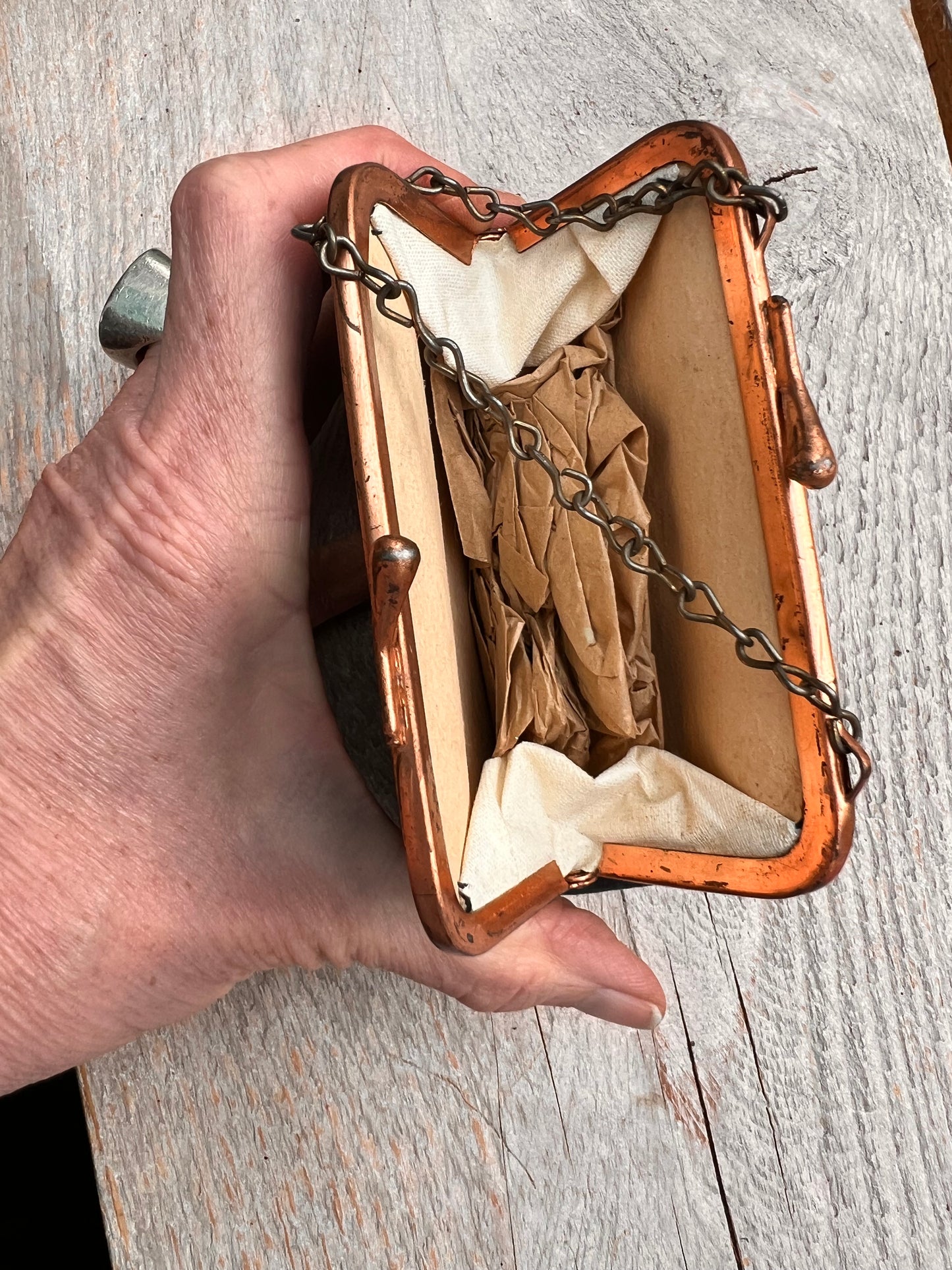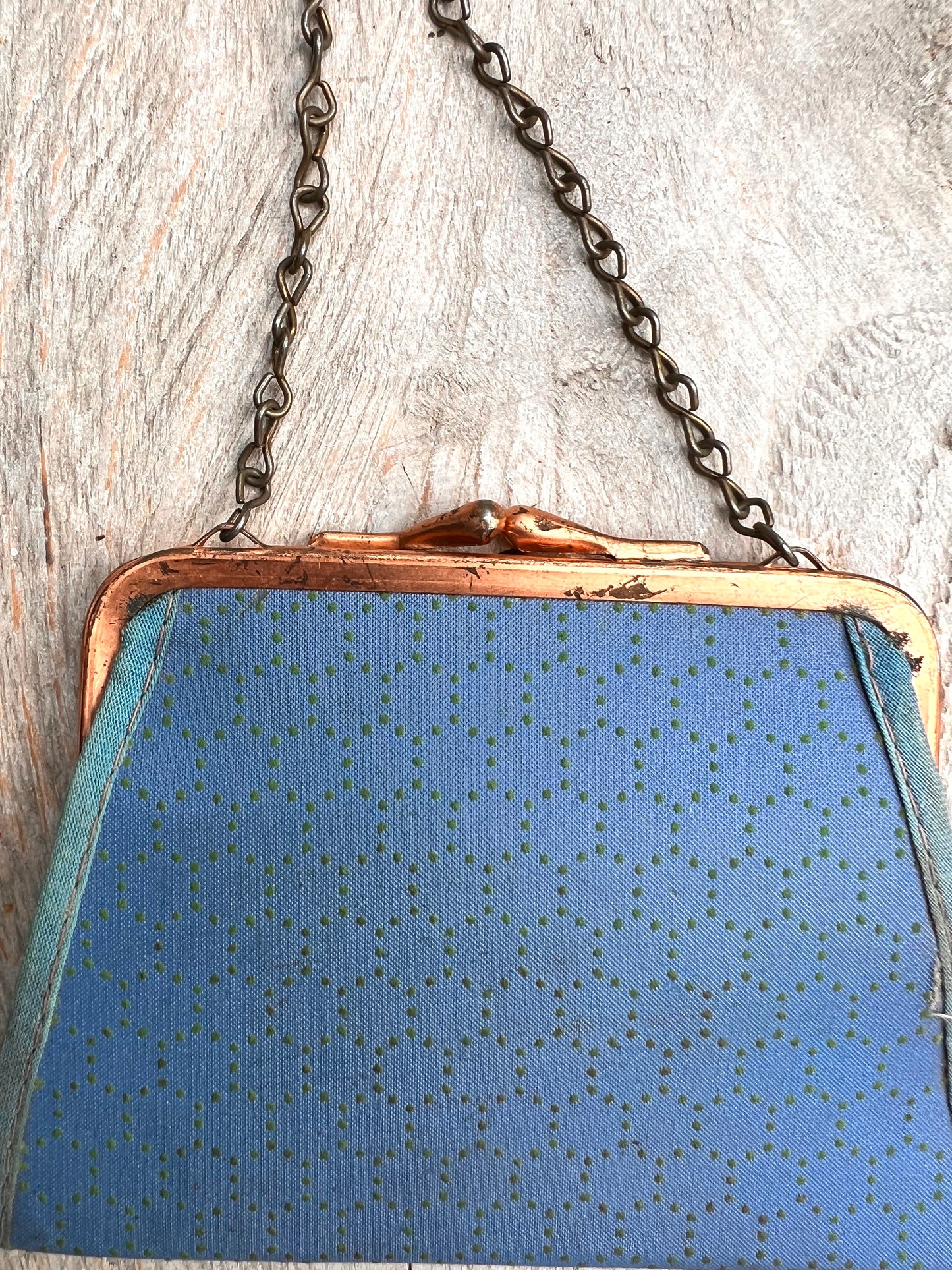 Tiny bag, more like a purse, with subtle green pattern and little chain handle.