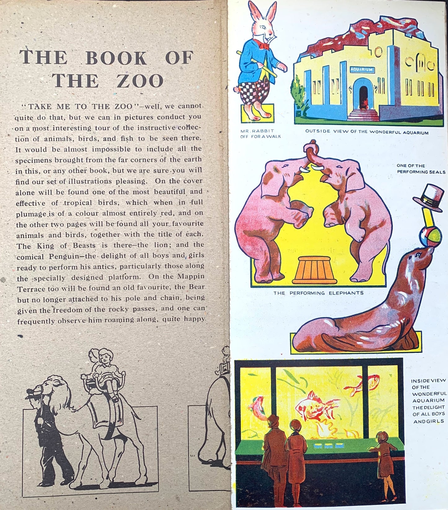 Printed in England in the 1930s this 3 part fold out Picture and Story Book entitled The Children's BOOK OF THE ZOO has 3 big pages of colourful illustrations of some animals found in zoos and their enclosures.