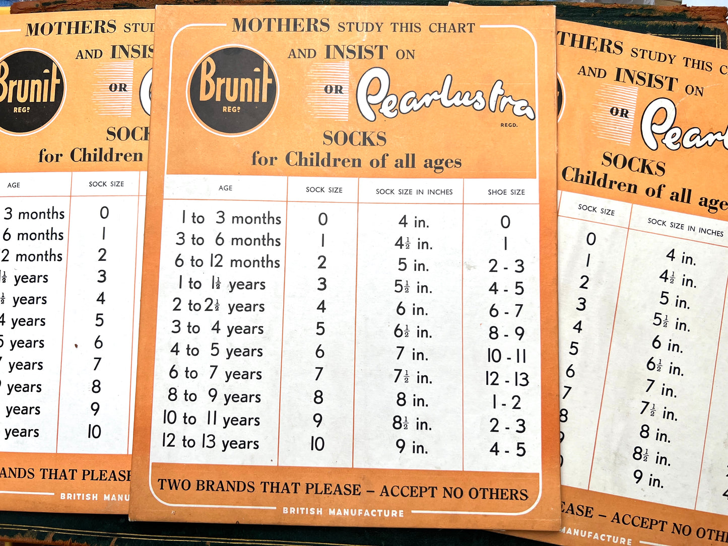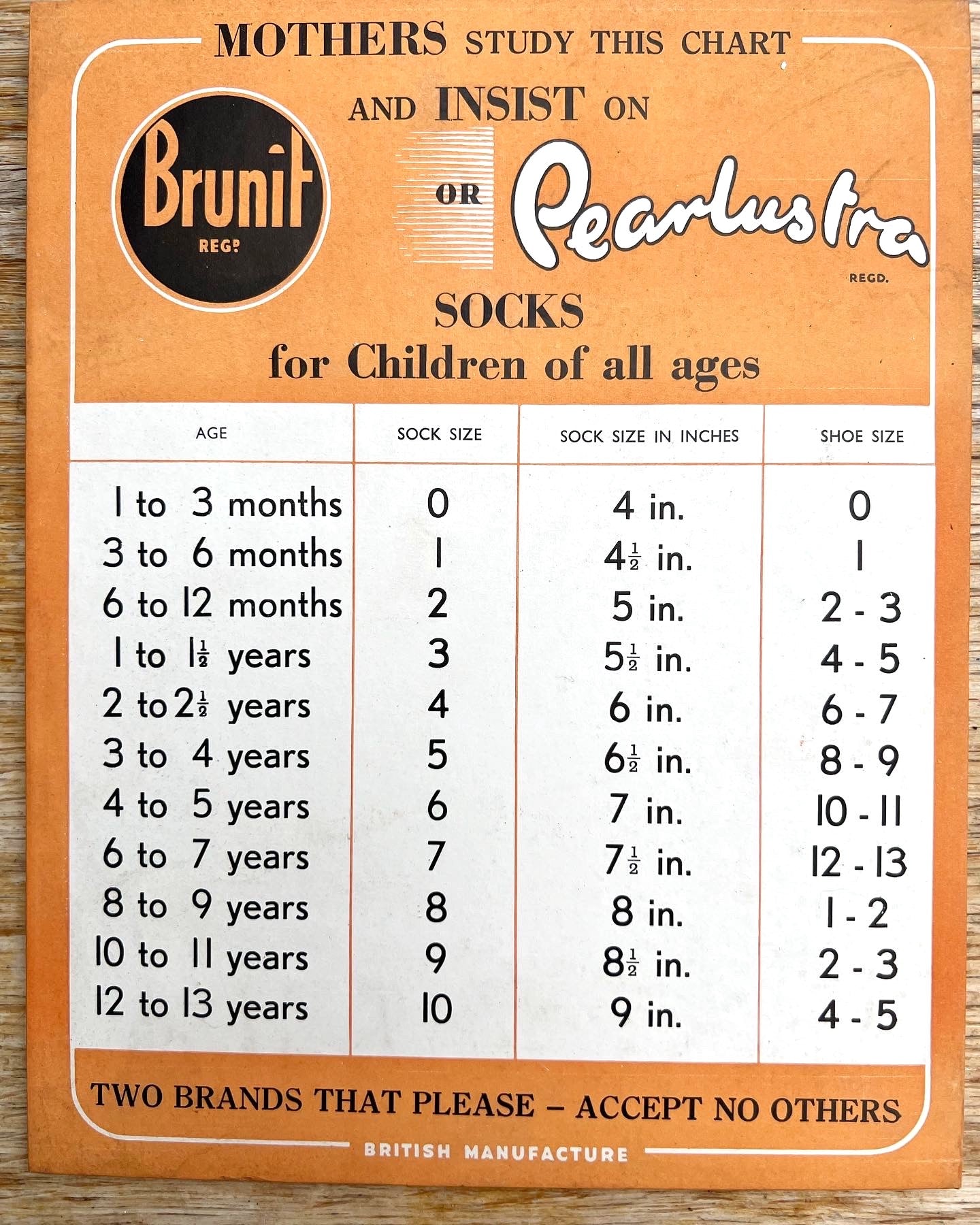 Old Shop Point of Sale Size Chart for Childrens Feet and Socks