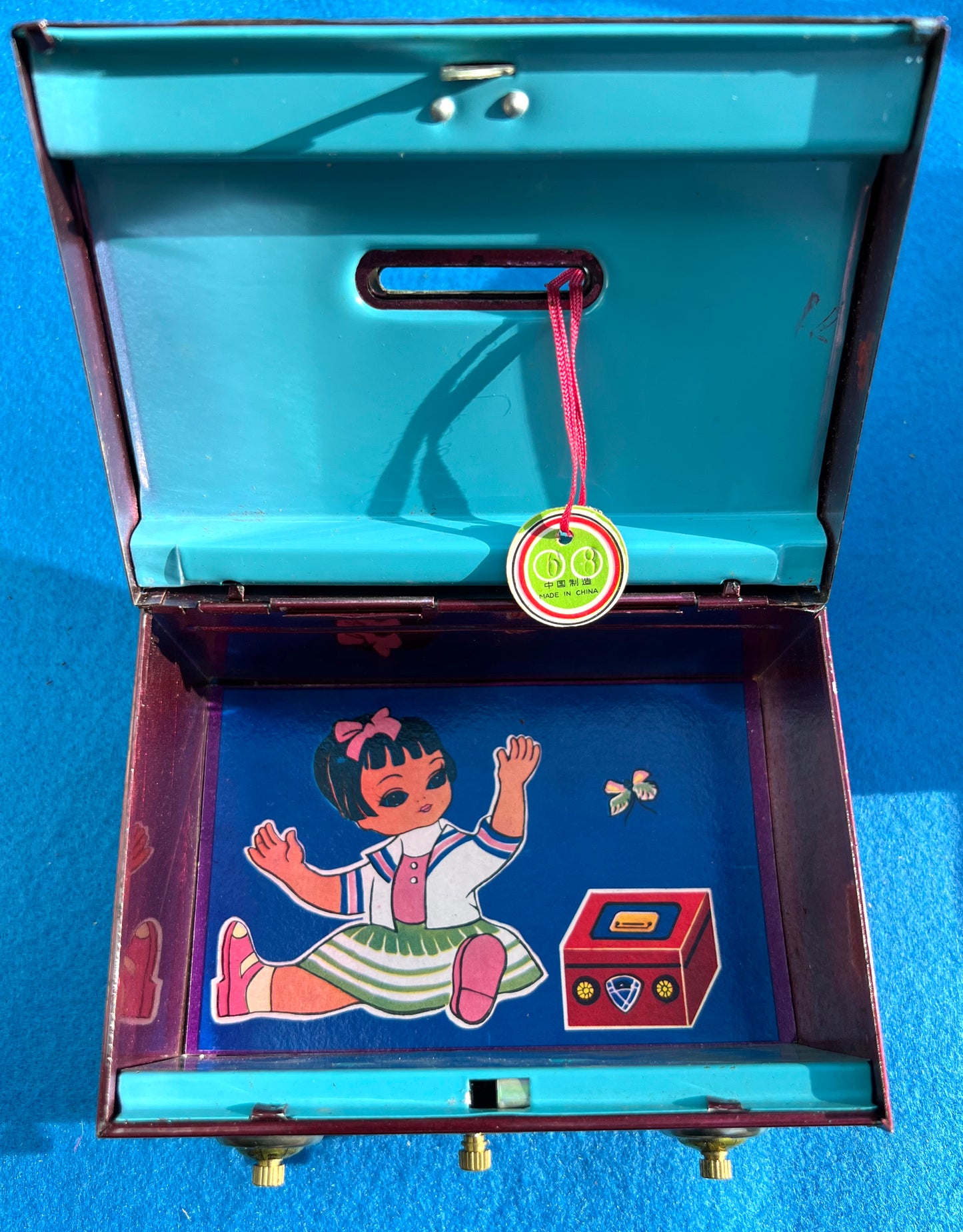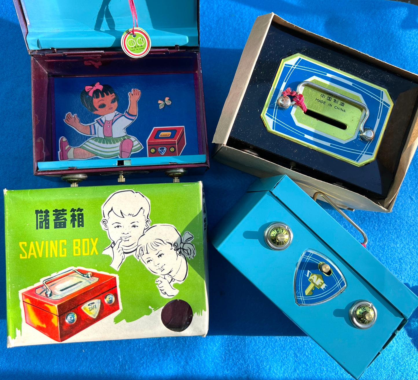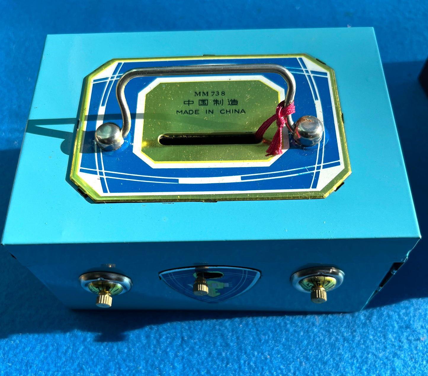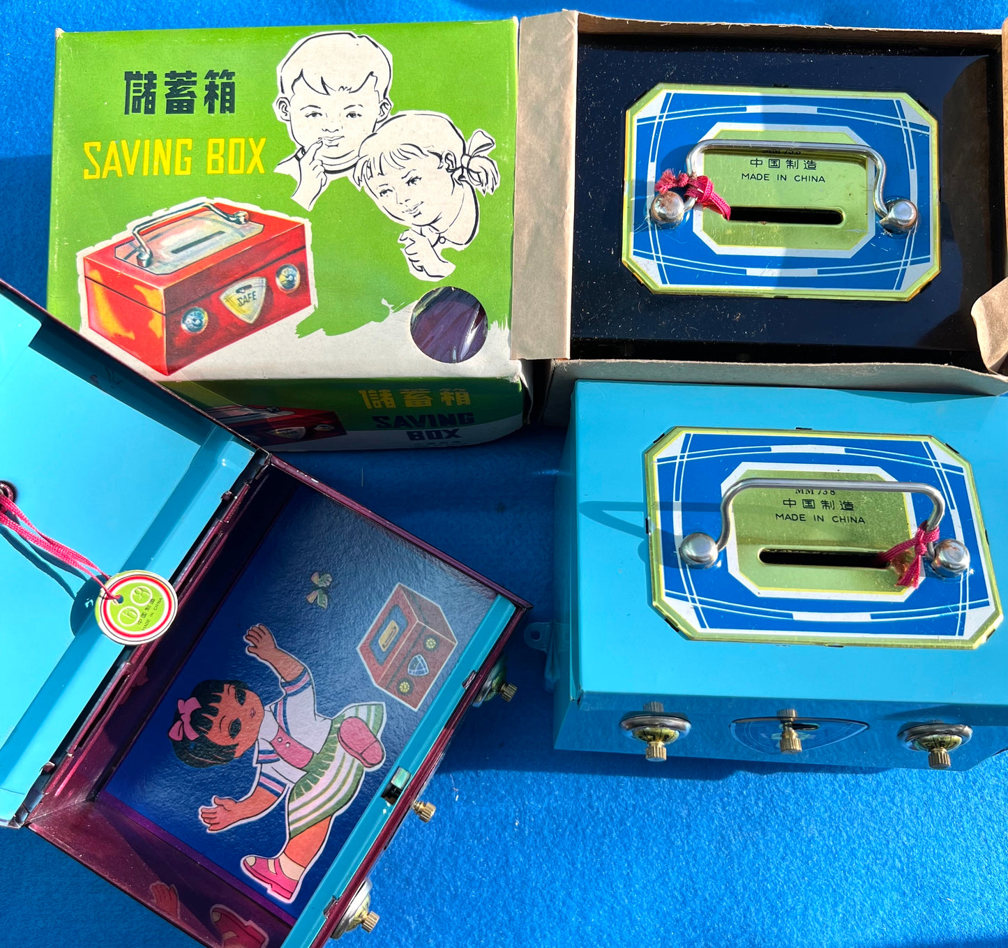 On the cardboard box and on the top of the tin saving box is printed "MM 73 8" then Chinese symbols which translate to "Made in China", and then "Made in China" in English.