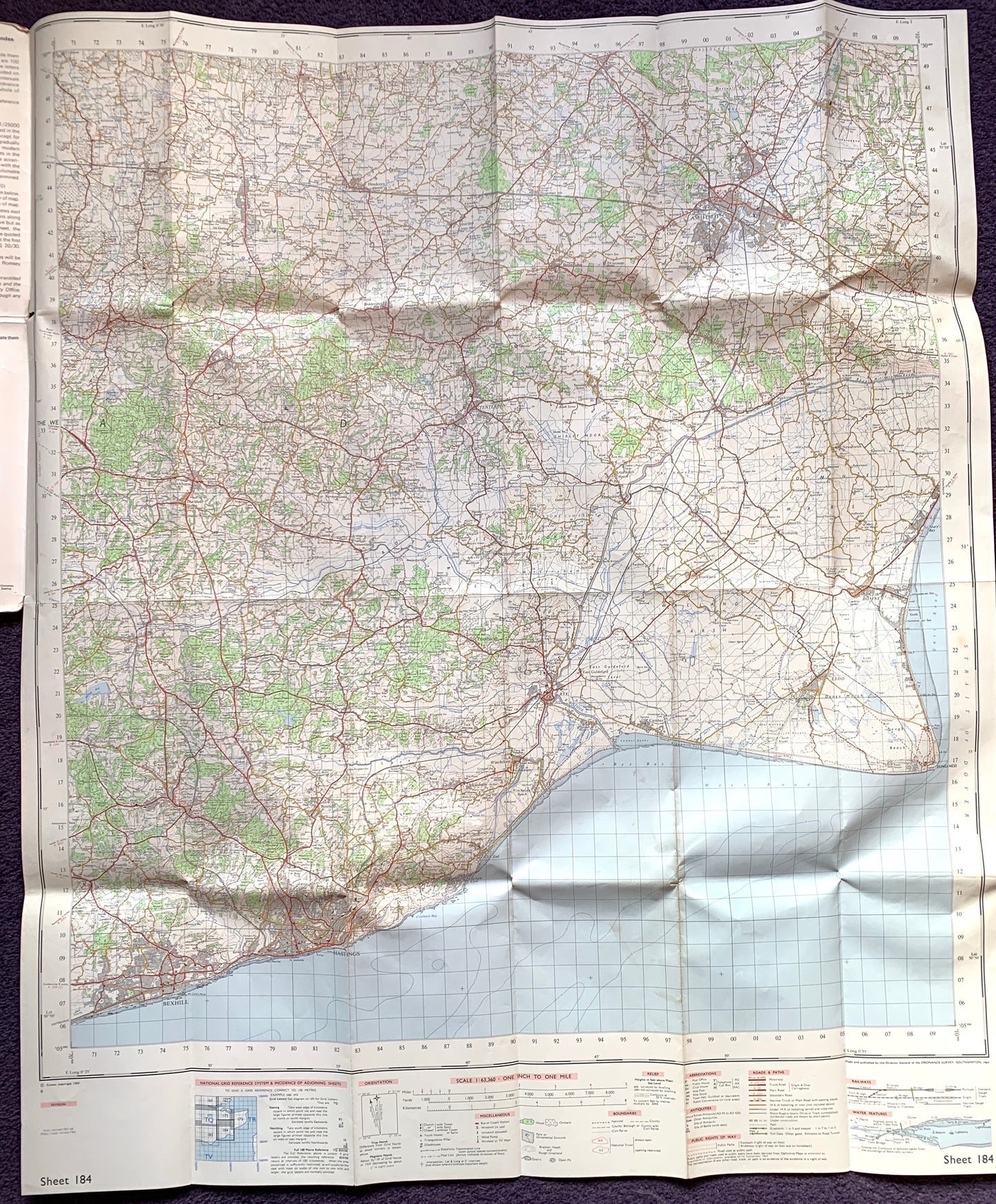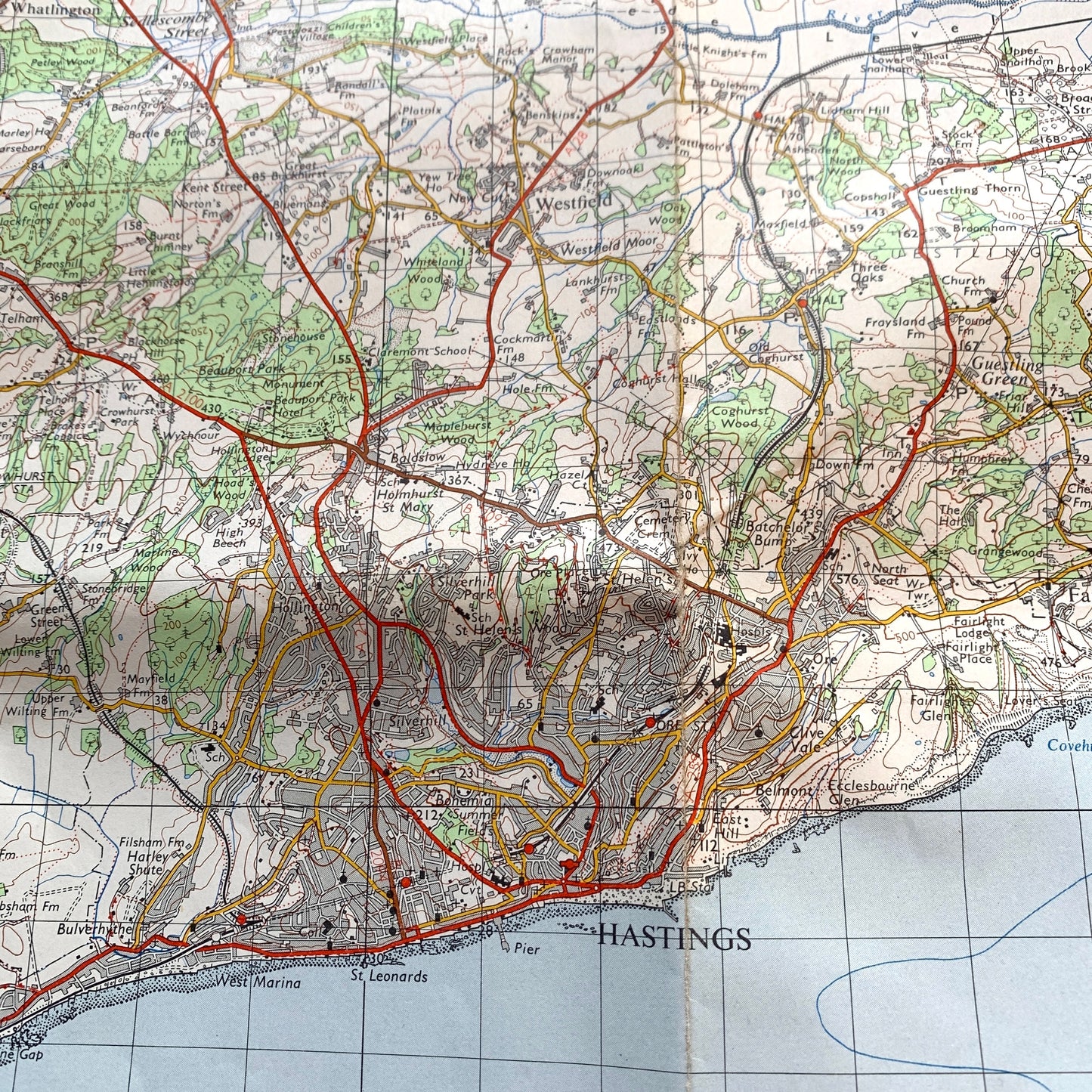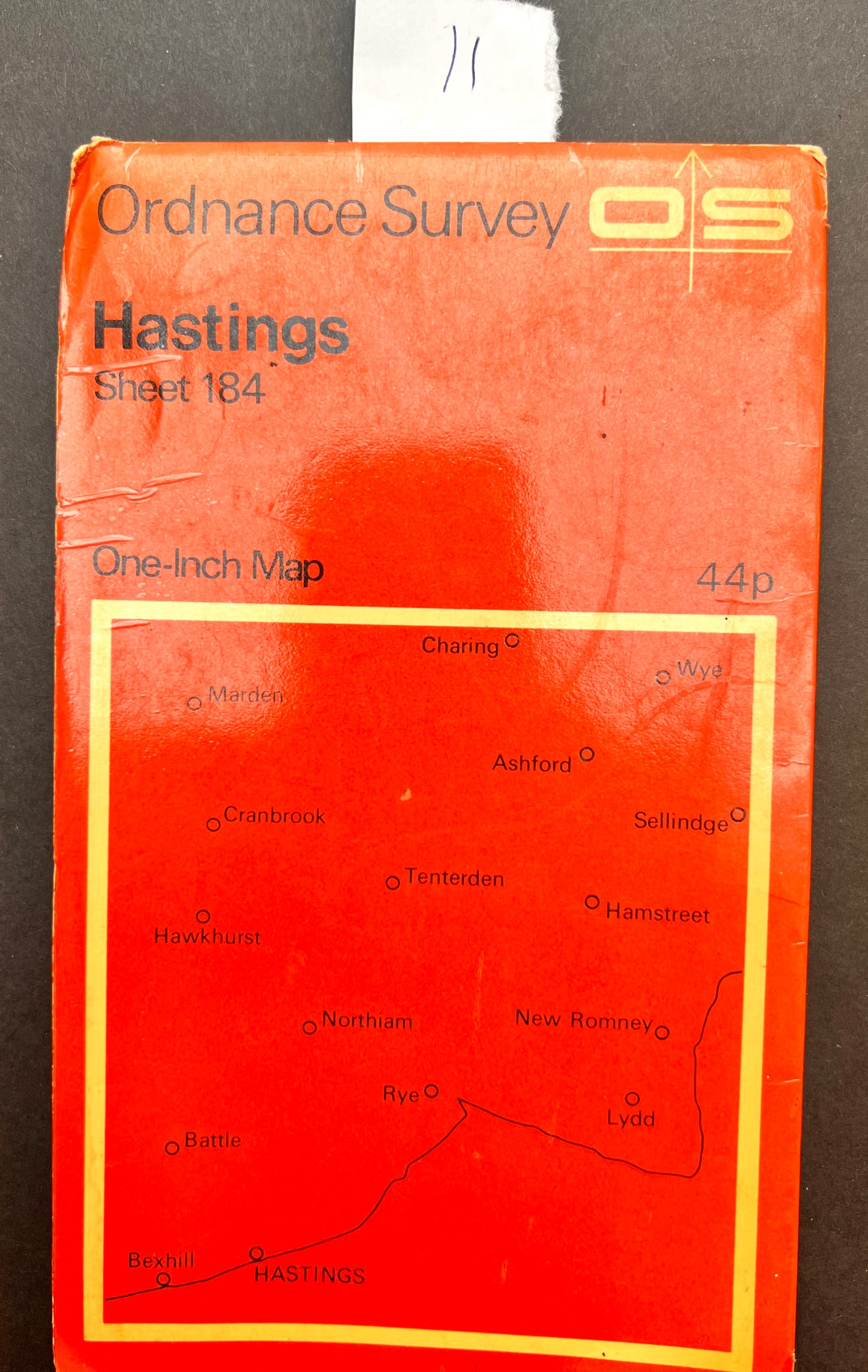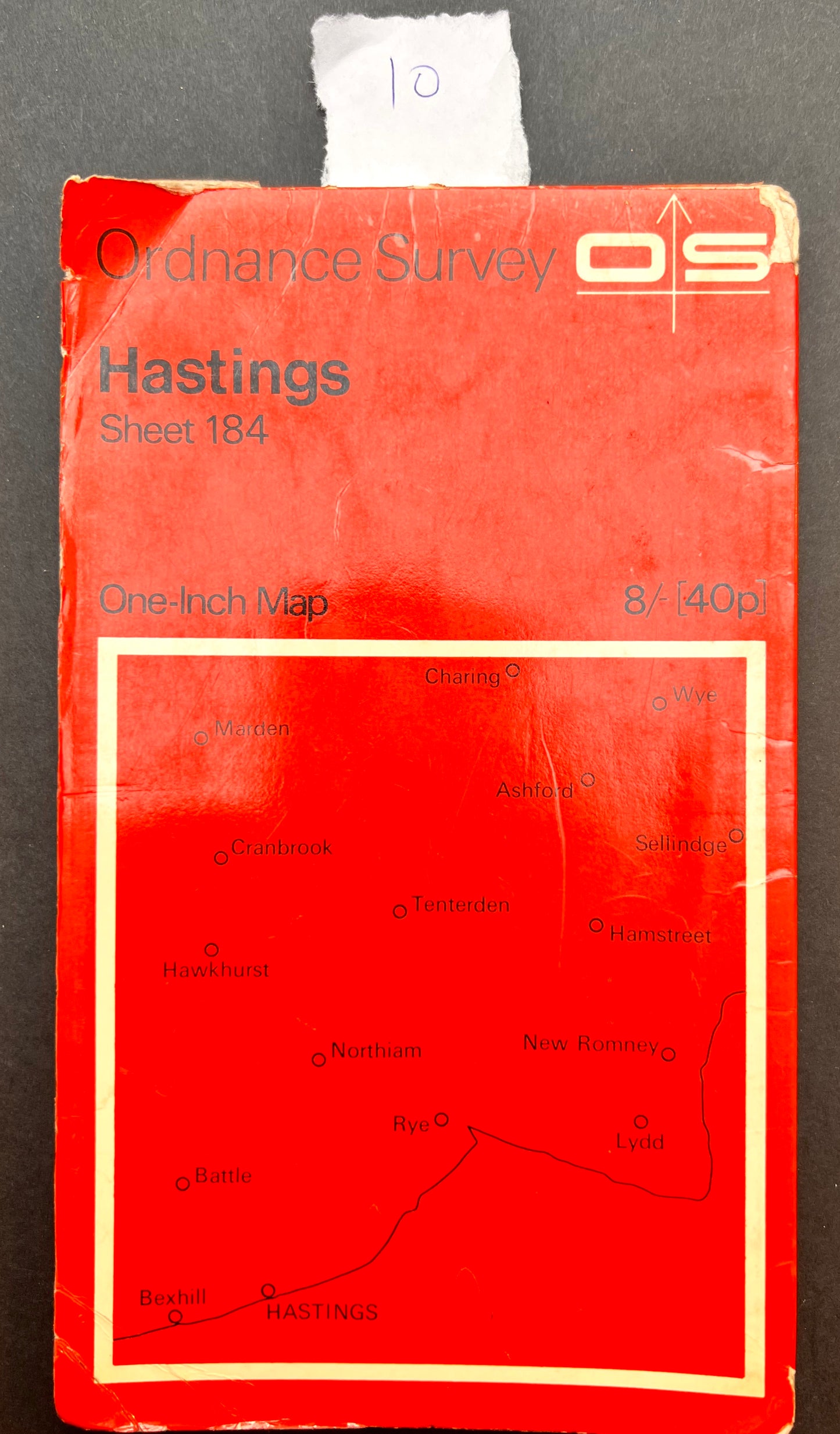 Published in 1969. Sheet no 184 of Hastings and surrounding area including Bexhill, Battle, Cranbrook, Tenterden, Winchelsea, Rye, Lydd, New Romney, Ashford, Dungeness.