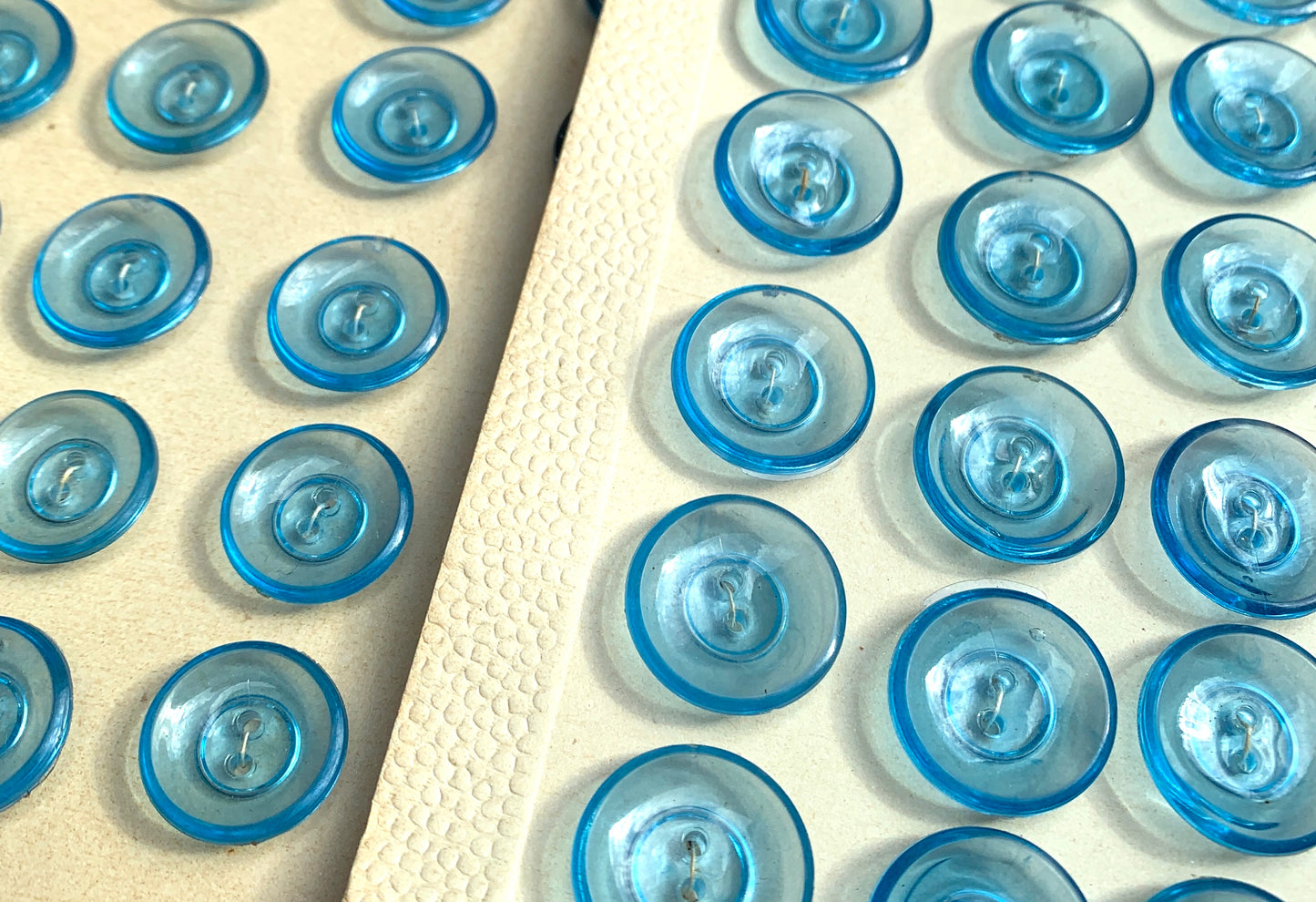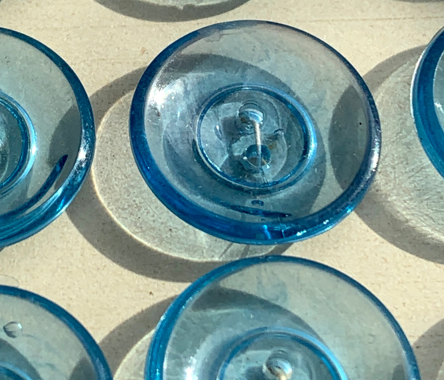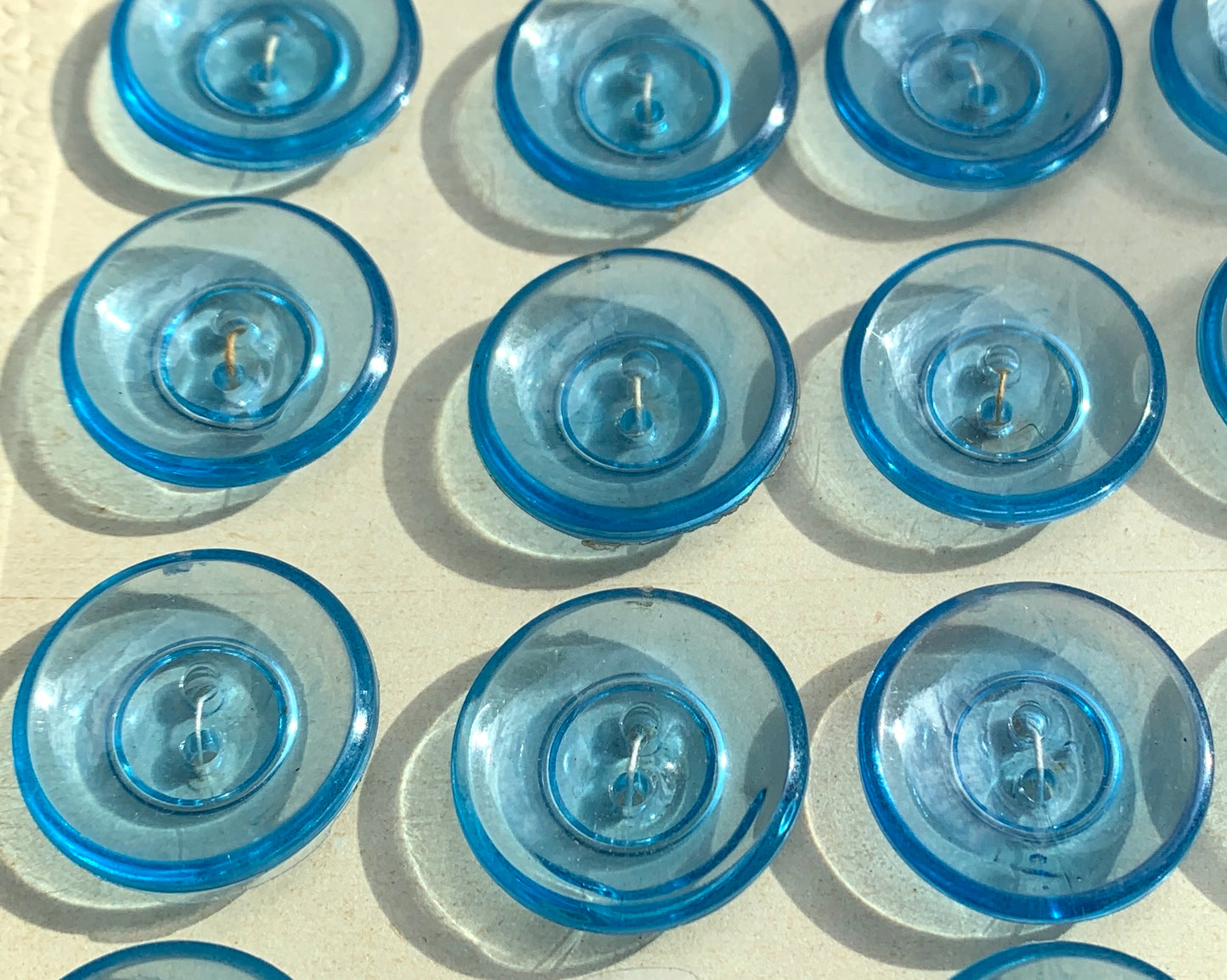 These vintage plastic buttons are the most gorgeous colour a shimmery almost see through azure blue that ebbs and flows as the concave buttons catch the light