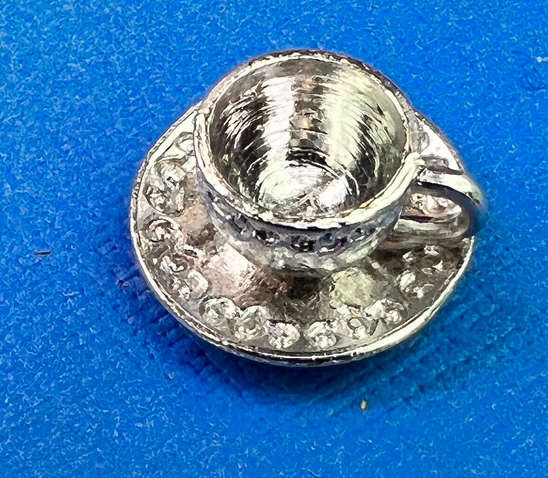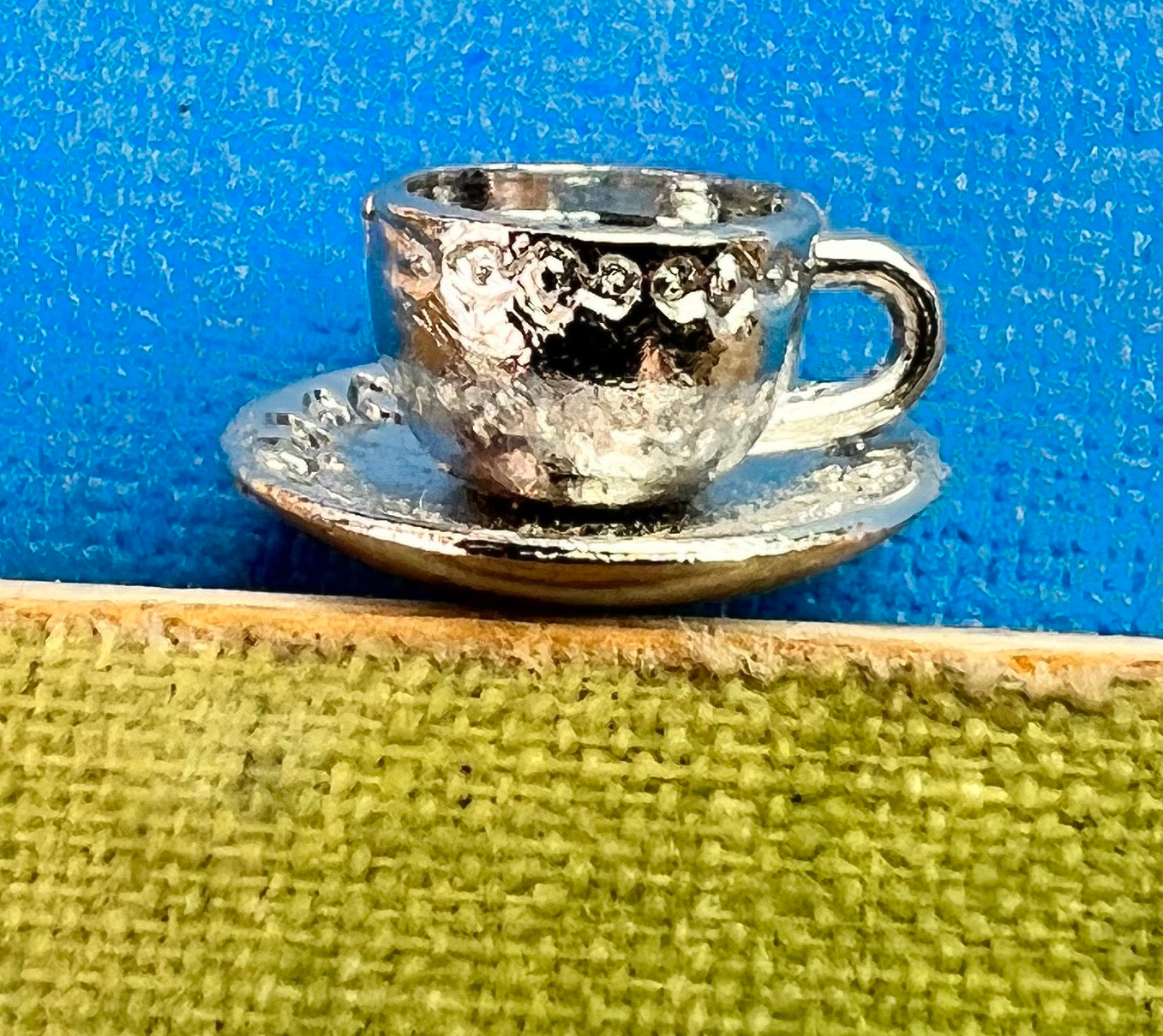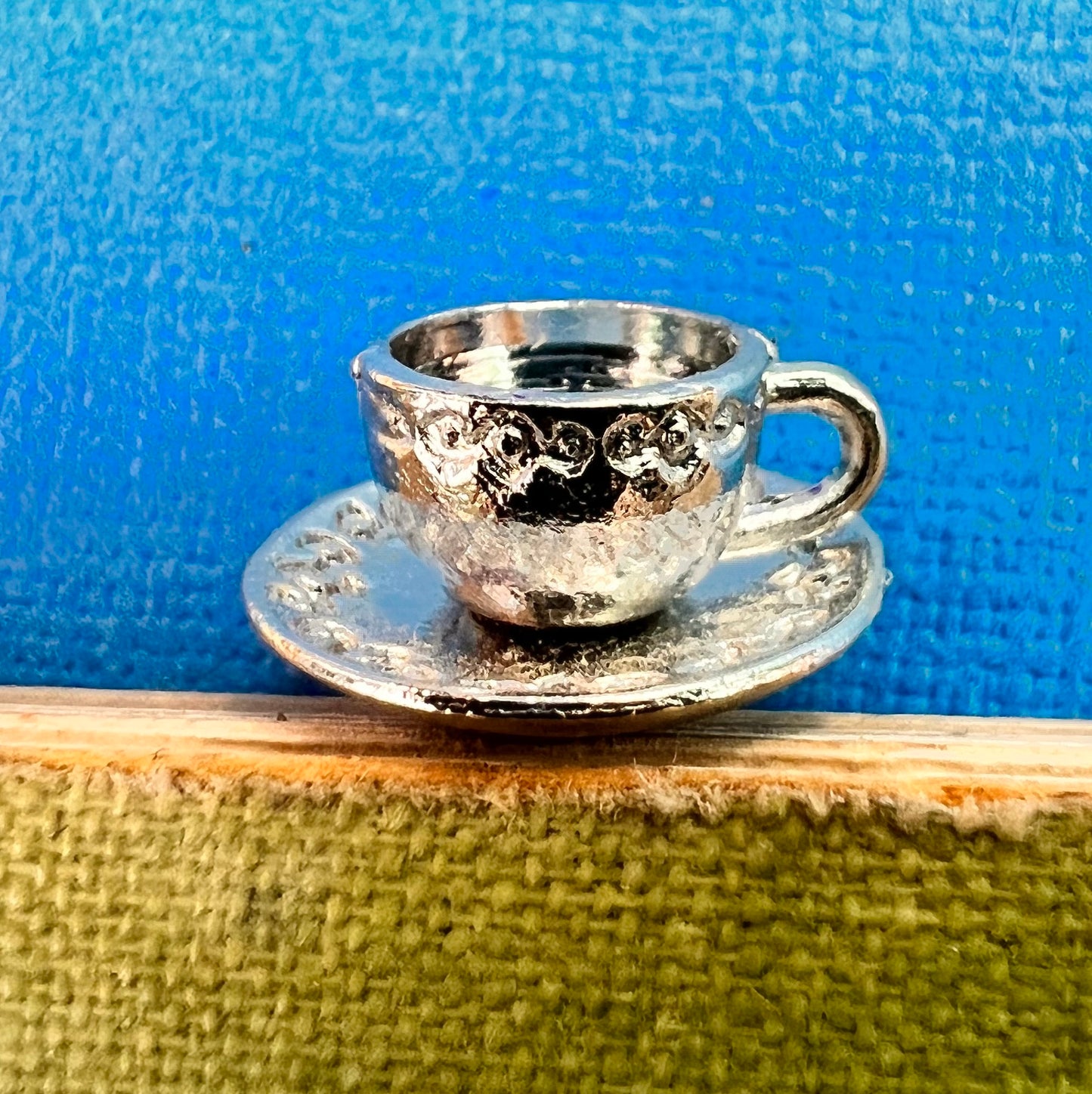 1.4cm wide, shiny silver tone metal, a 3D cup and saucer with a slight decorative pattern.