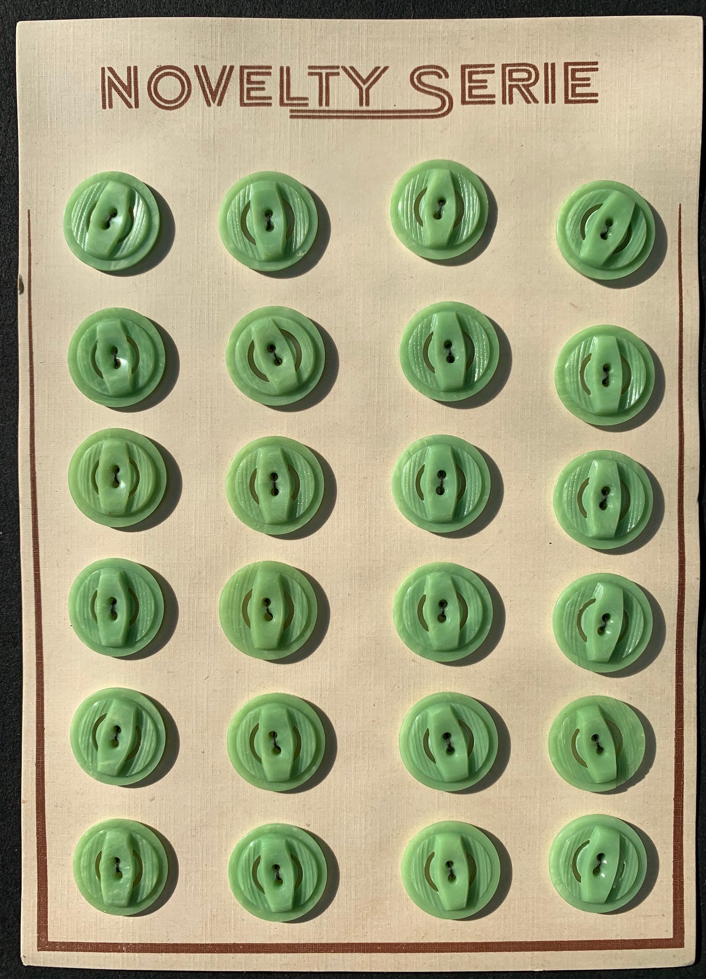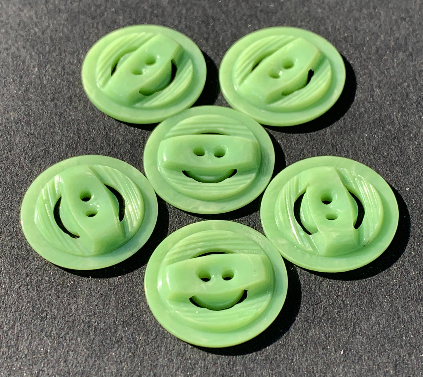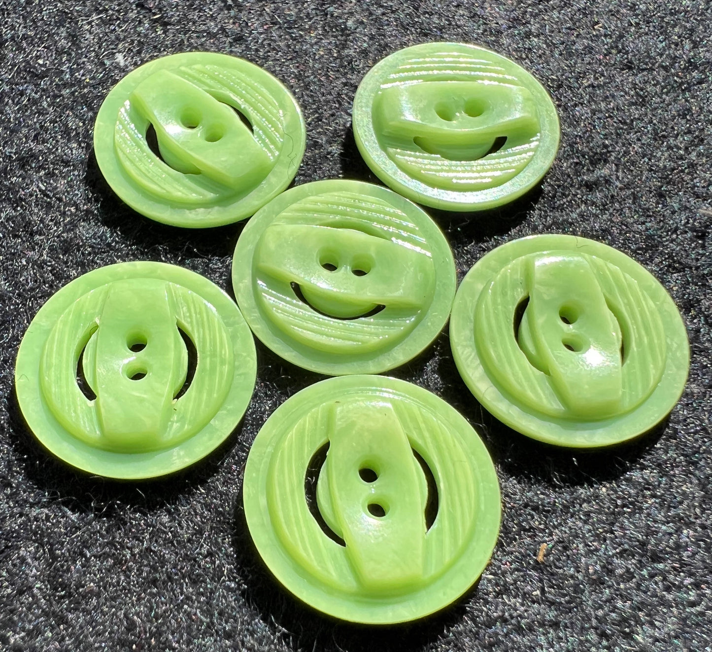 These 1.8cm vintage plastic buttons were carved by machine giving them a textured multi level surface.