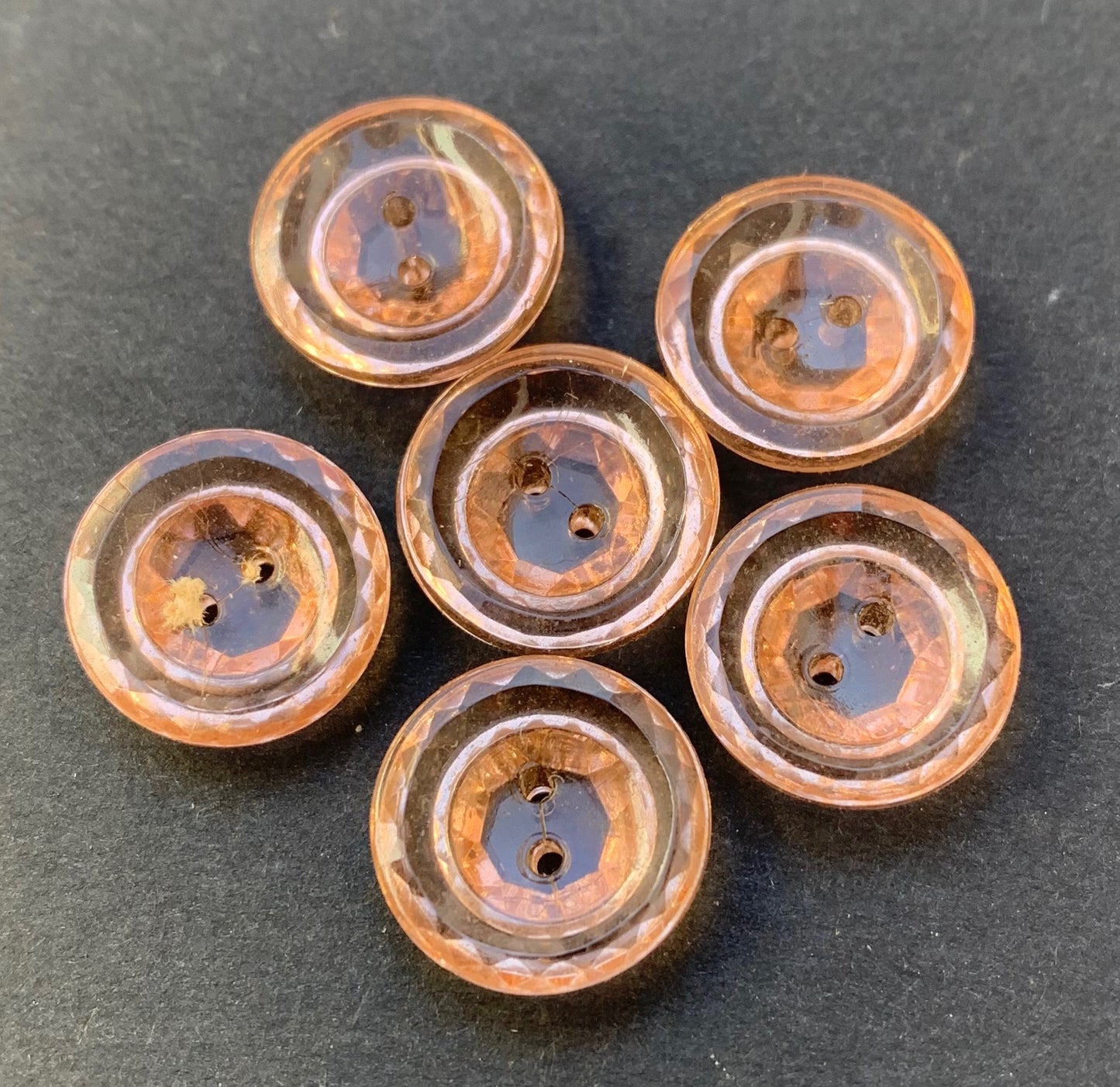 6 peachy pink glass buttons, slightly concave and cut on the underside to maximise sparkle and shimmer..