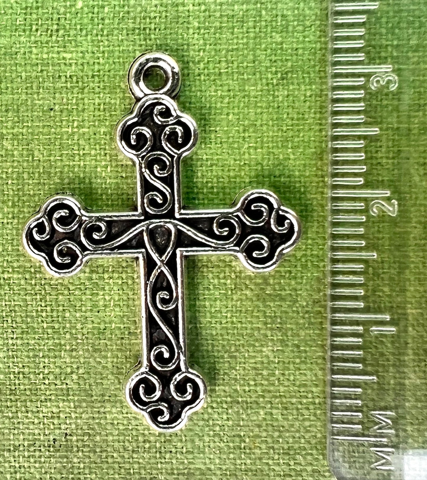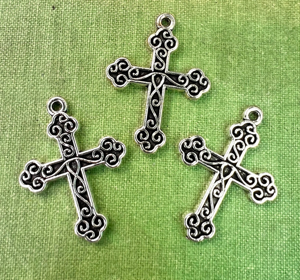 3 Silver Tone Ornamental Crosses - 3cm tall Charms / Pendants