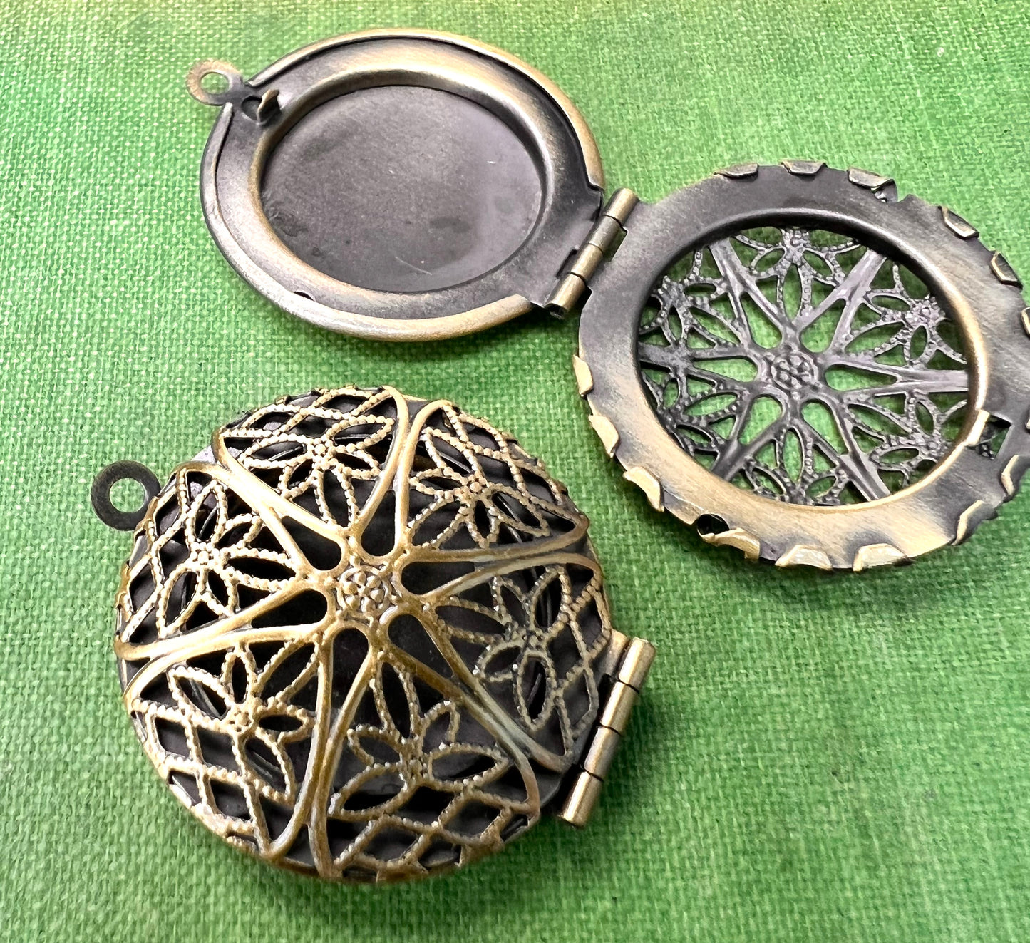 Made of a light bronze tone metal, 2.8cm tall, opens and closes, with spaces to put a picture.