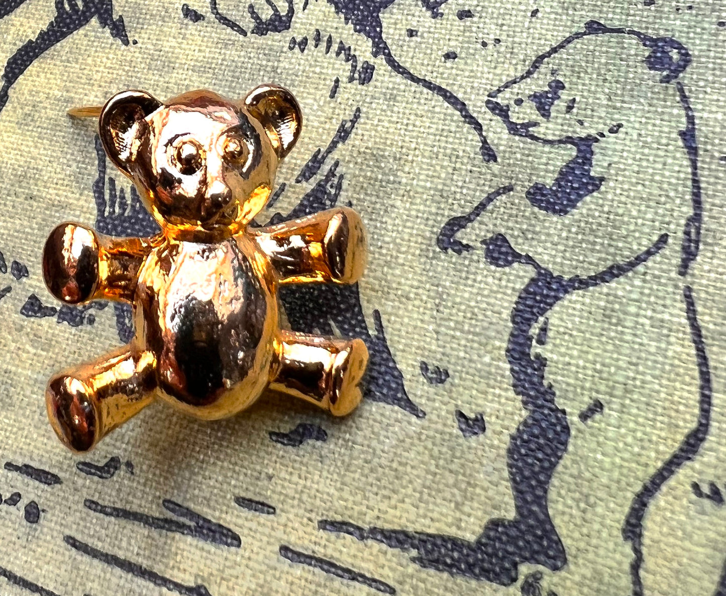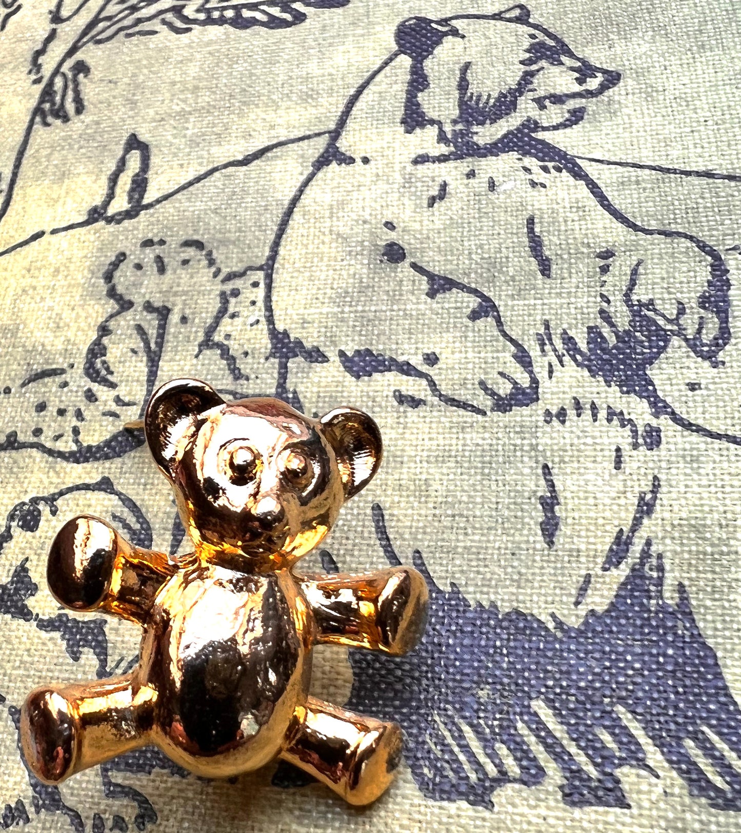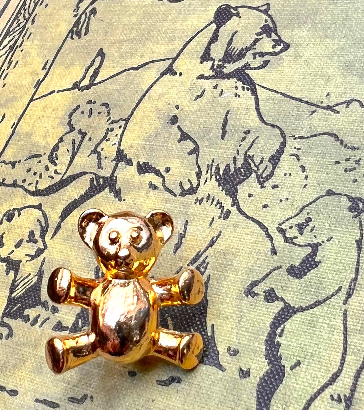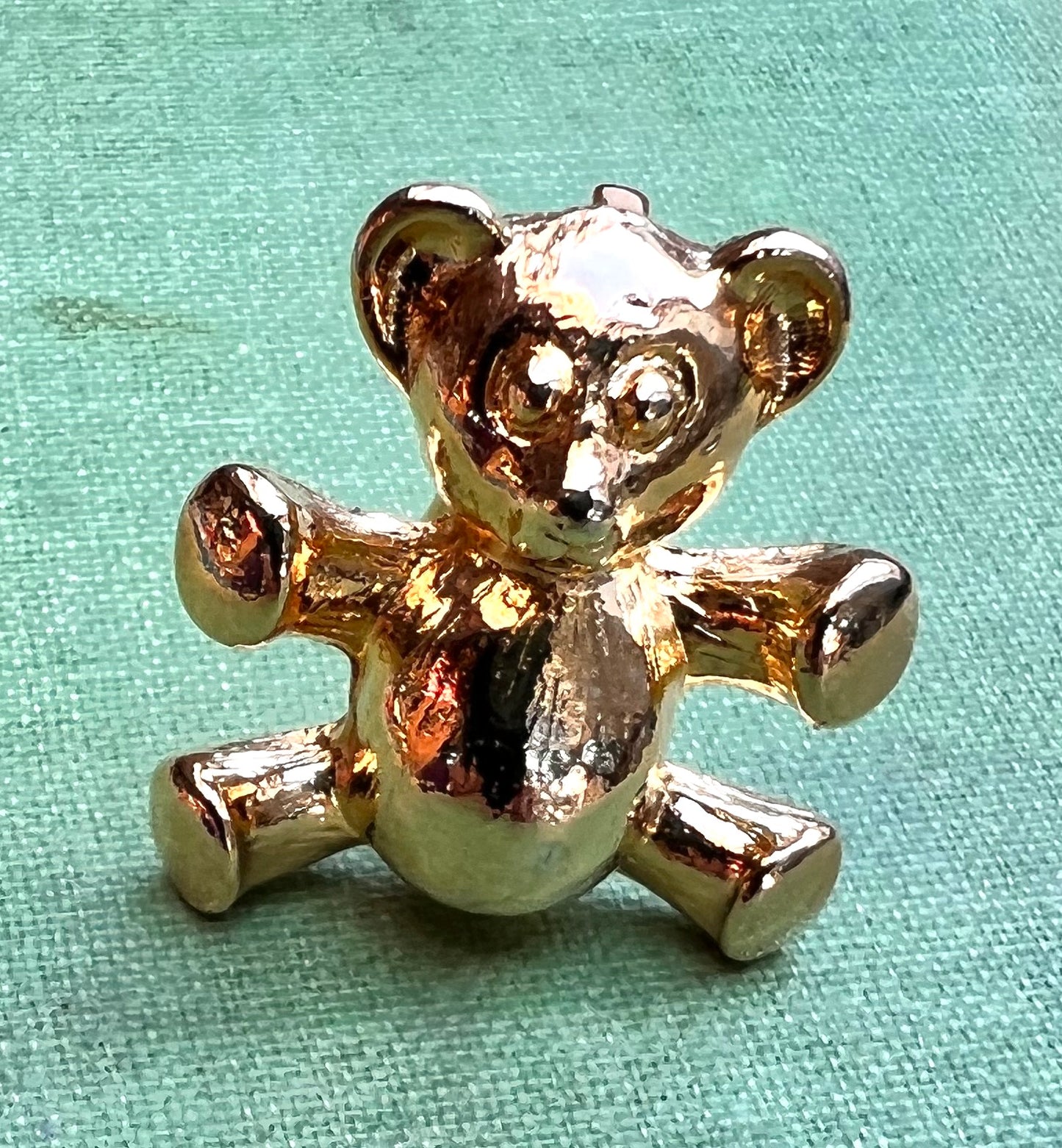 Mischievous black eyes and a happy little grin this gold tone metal teddy bear brooch is a delightful companion as you go about your day.