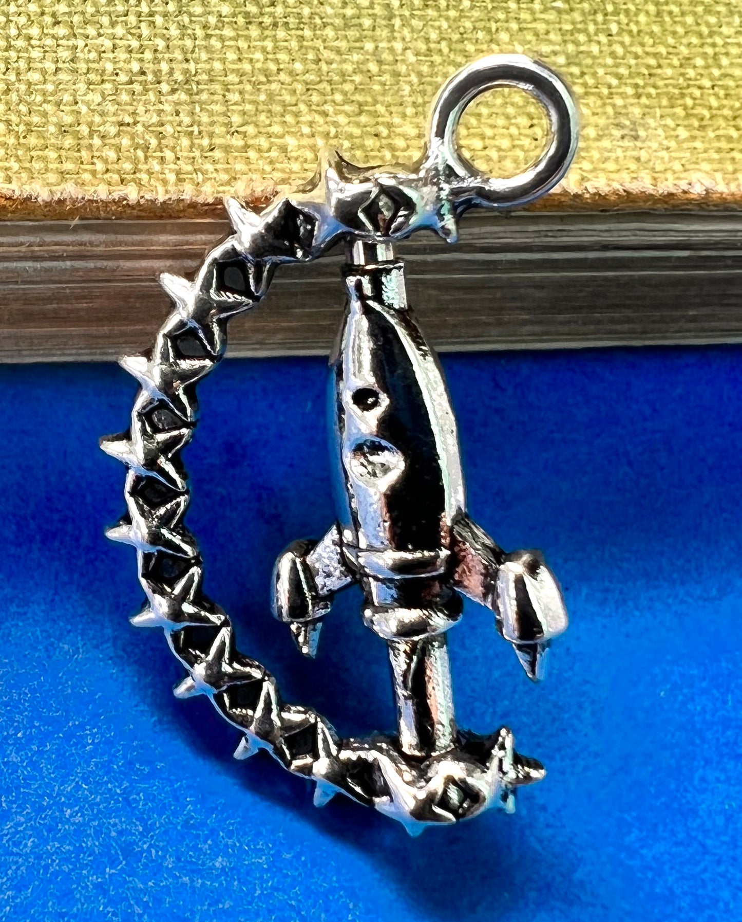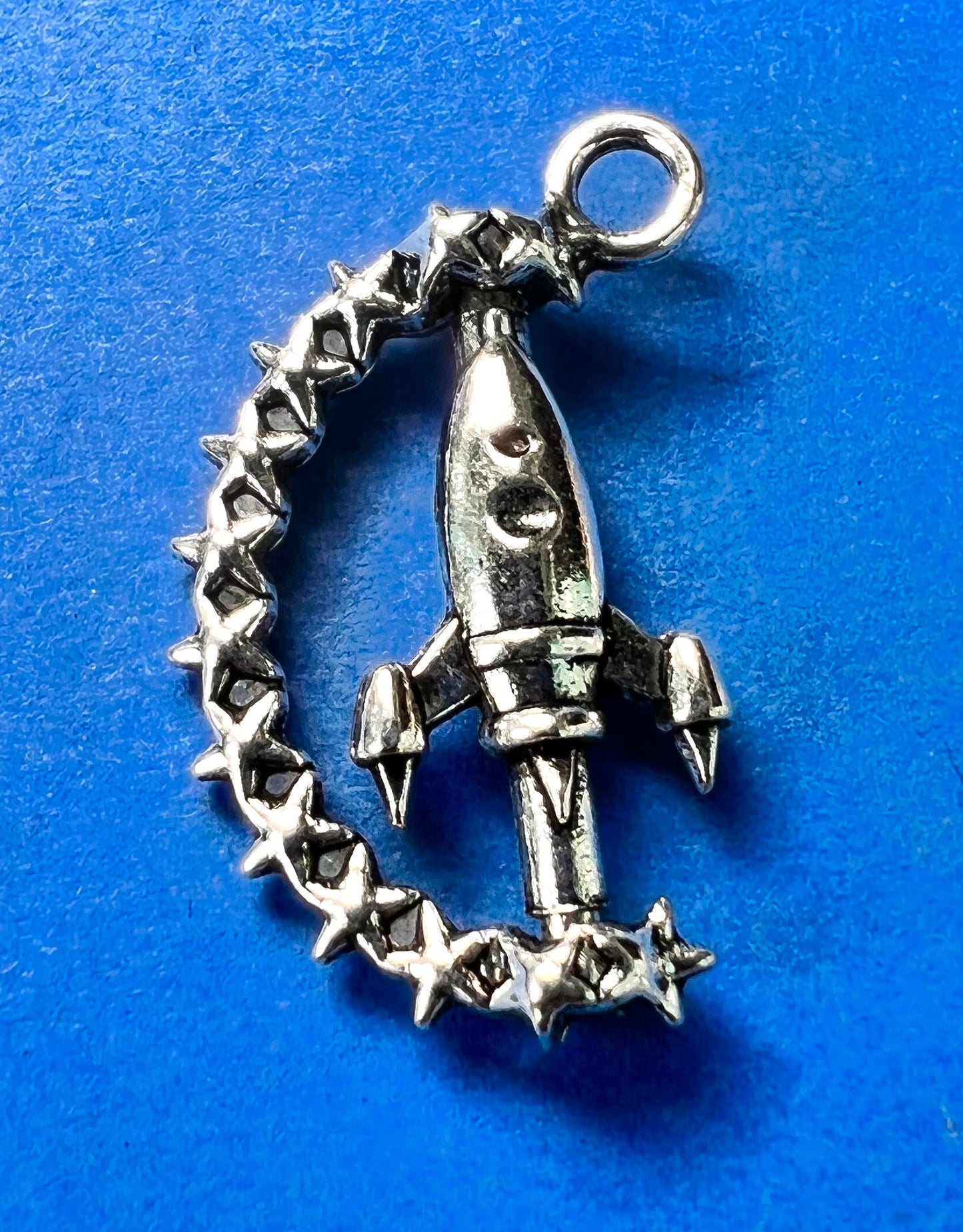 Just over 2cm tall this unusual charm/pendant is a crescent of stars with a rocket shooting between them - and the rocket rotates ! Would make a wonderful necklace or keyring for the Space appreciator in your life.
