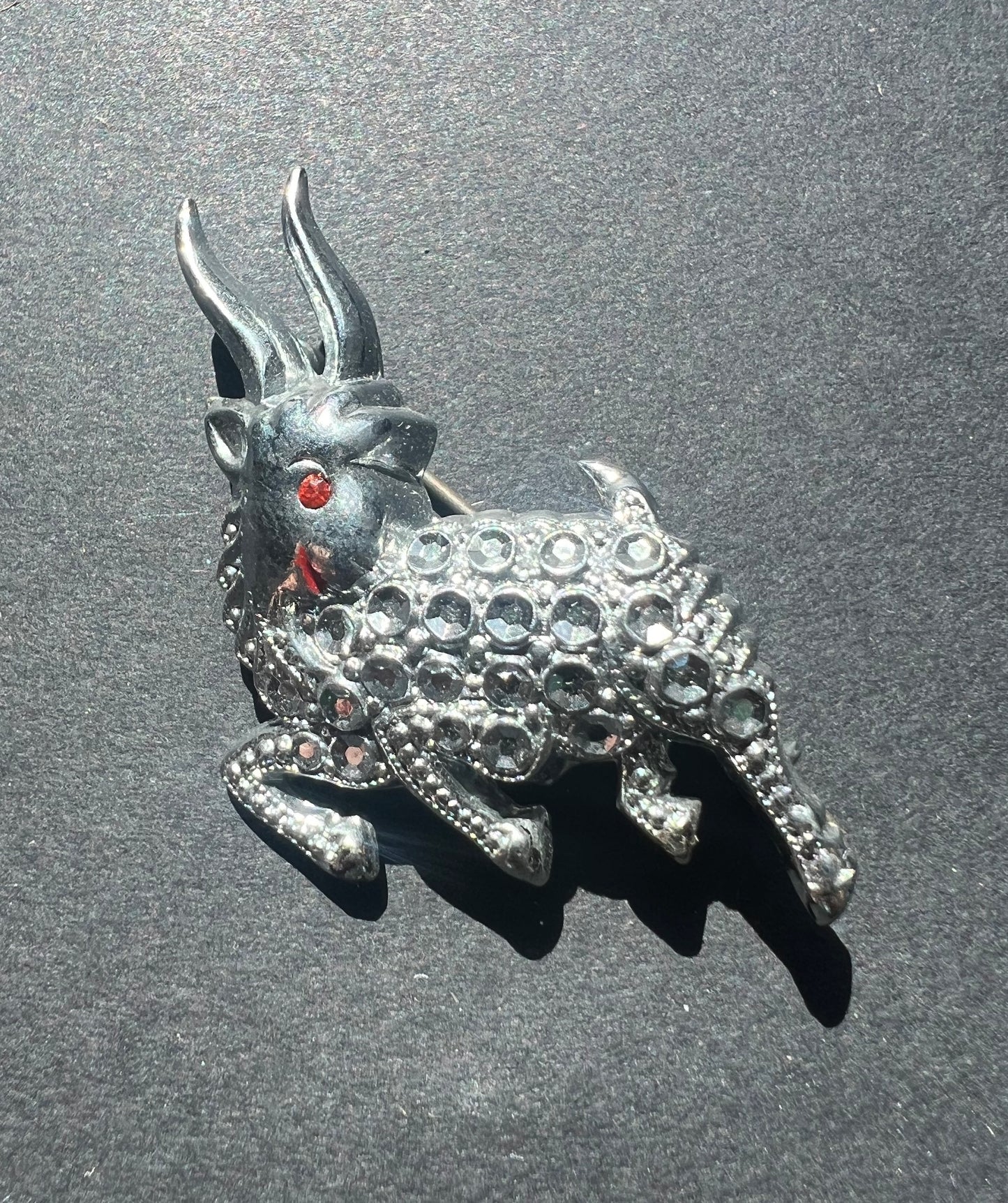 Faux marcasite, silver tone metal, 3cm long, 3.5cm tall, sparkly red eye and a strong clip on the back..