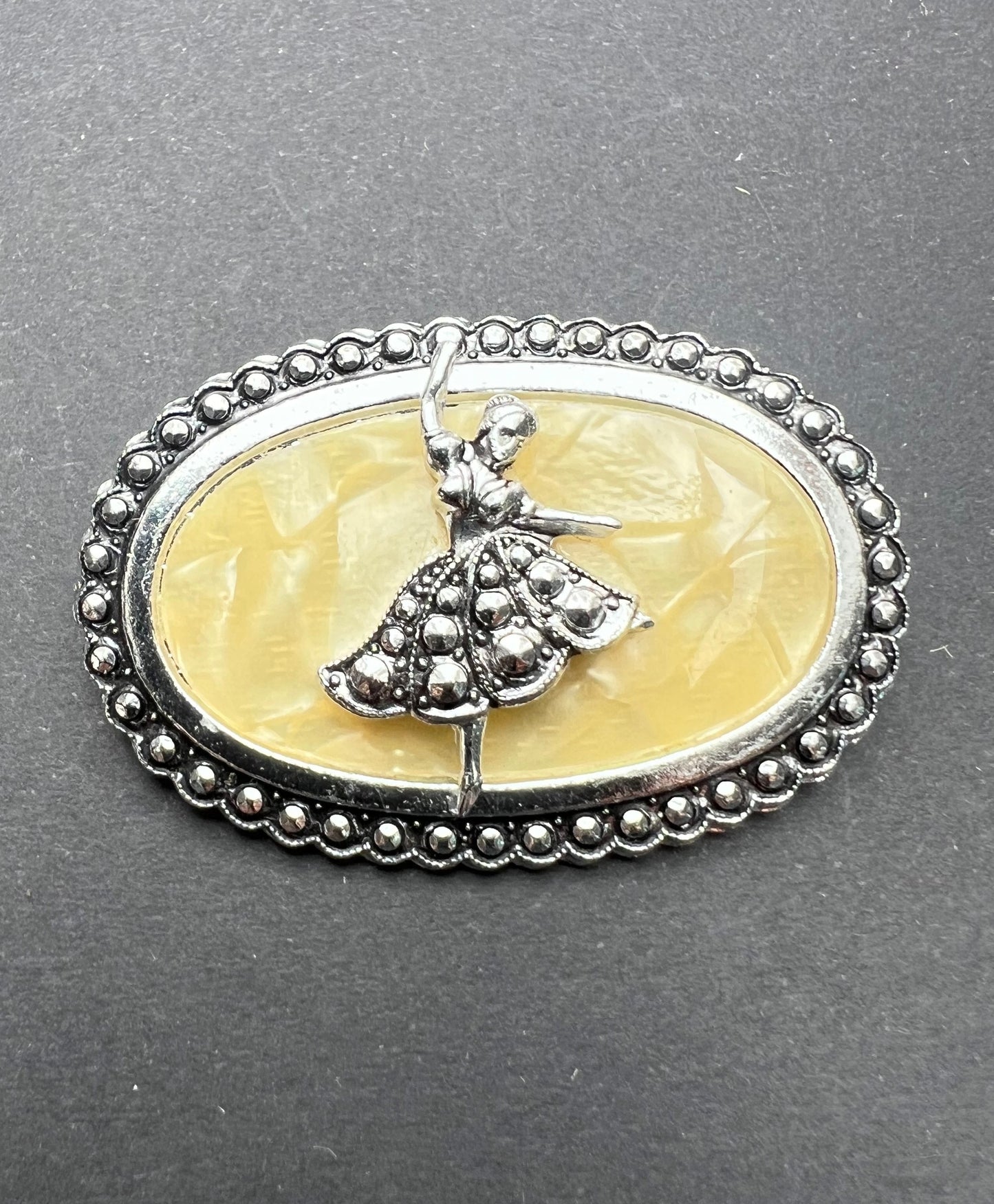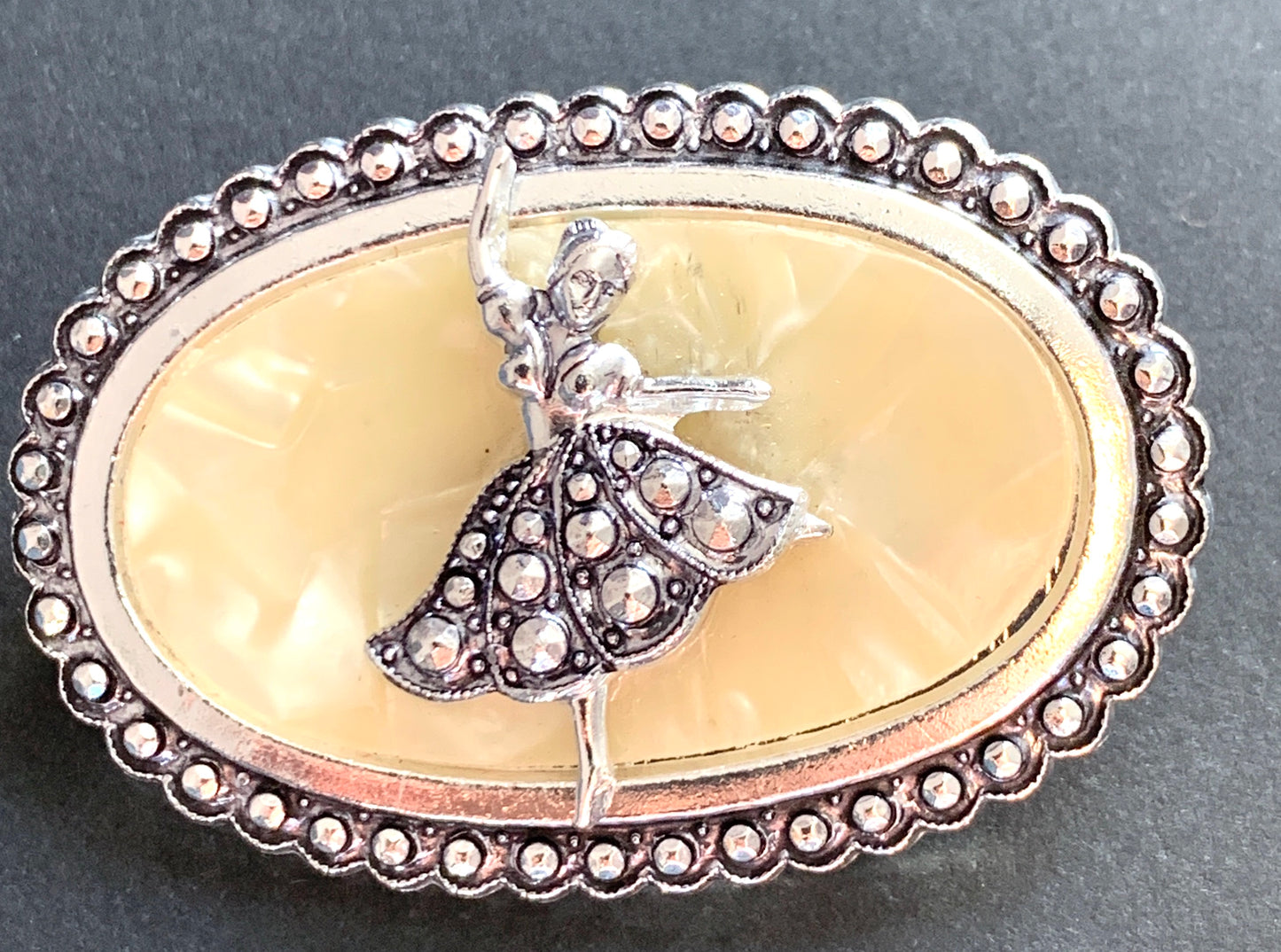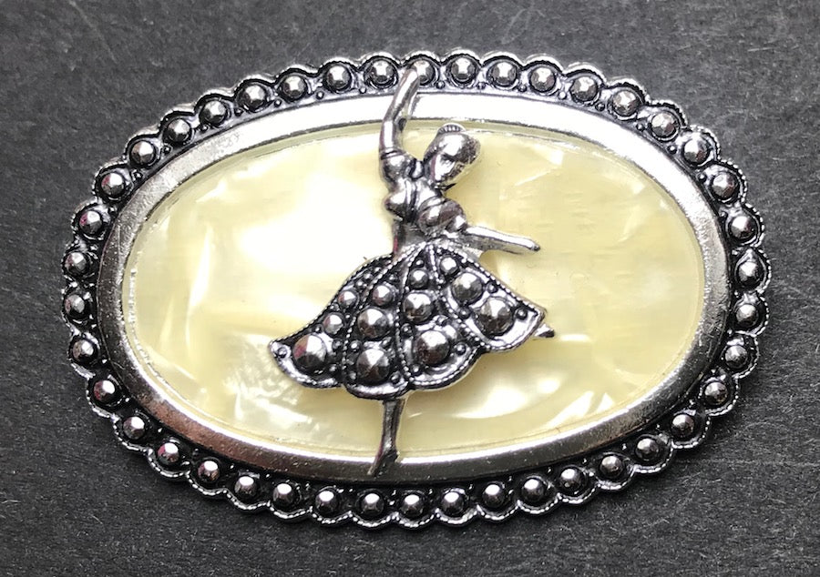 Faux mother of pearl background and twinkly faux marcasite surround and also on the dancers skirt.