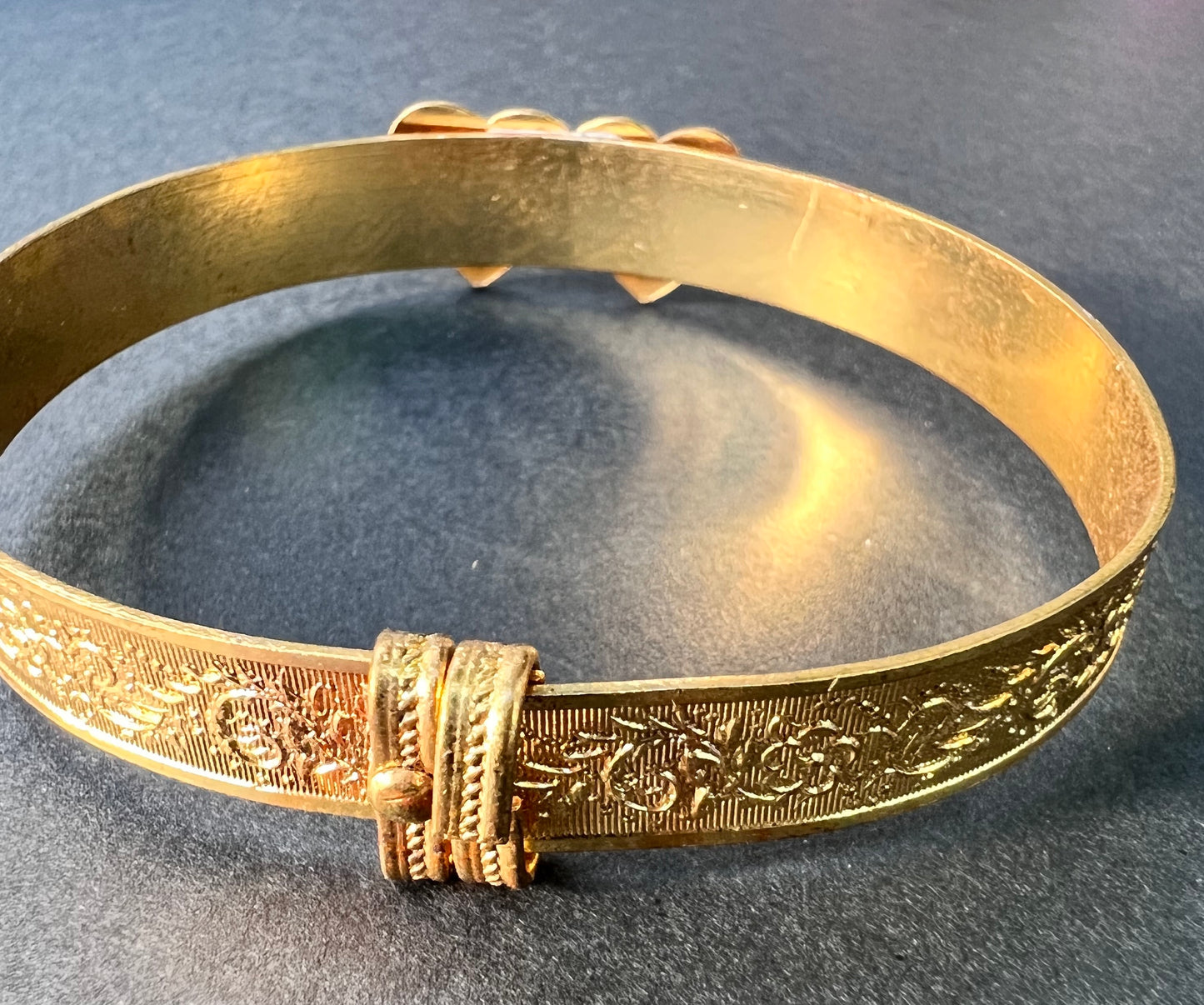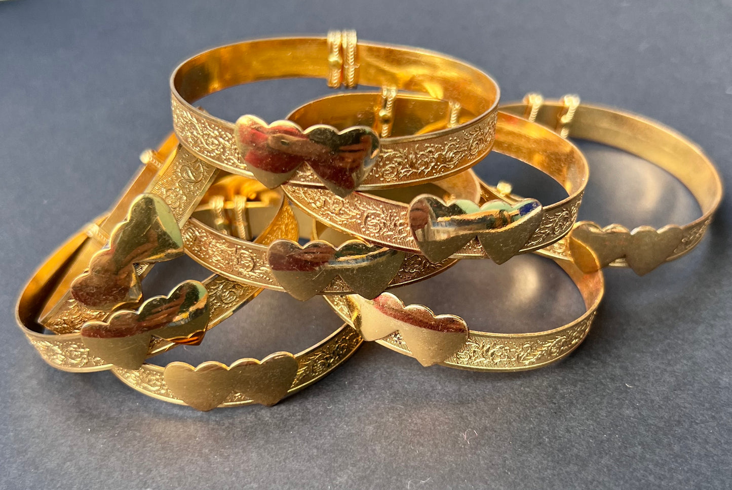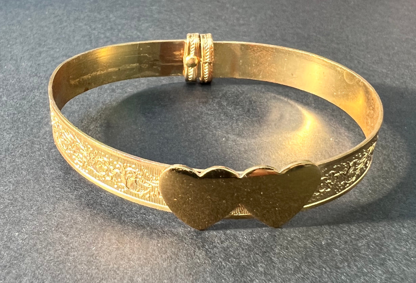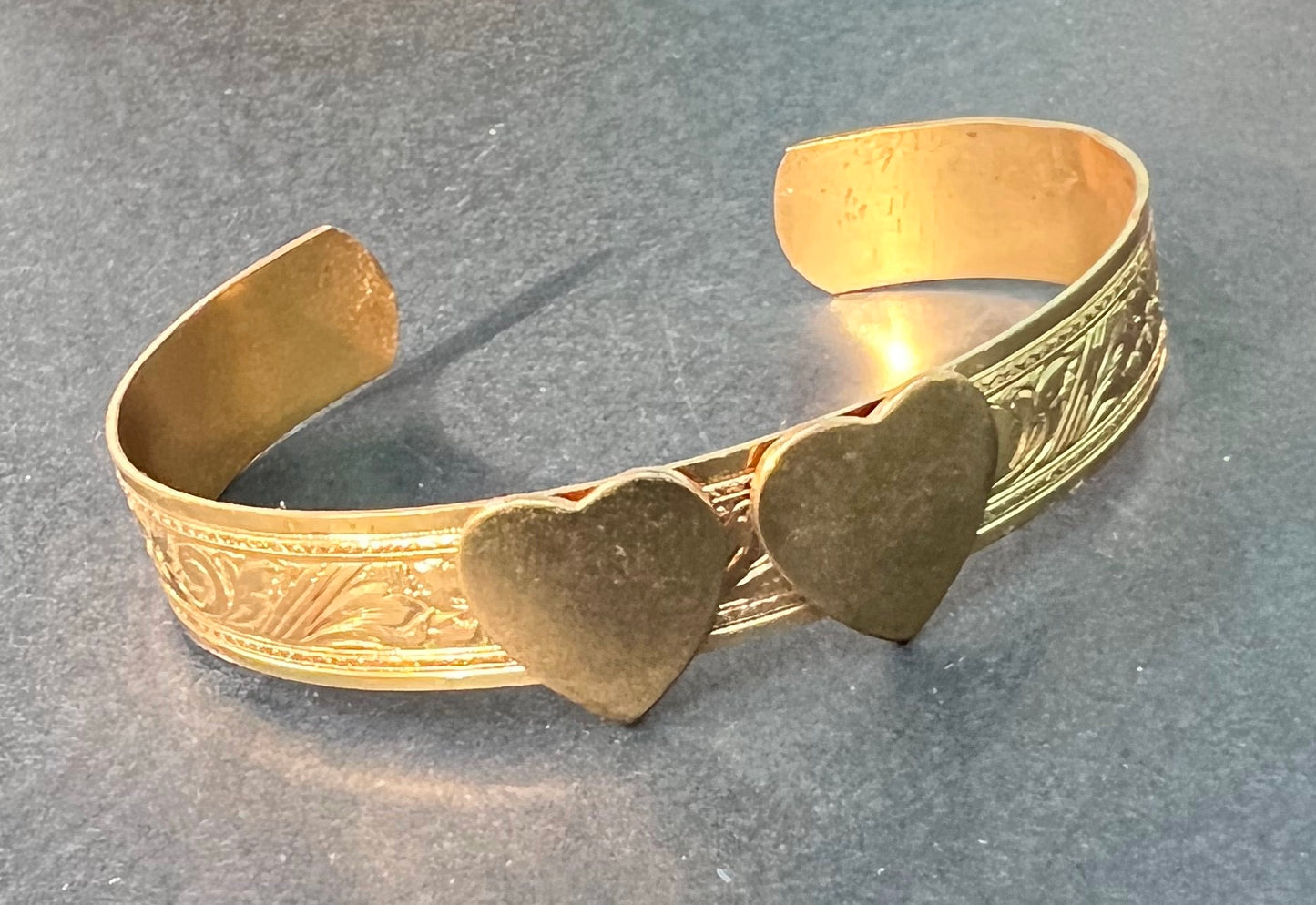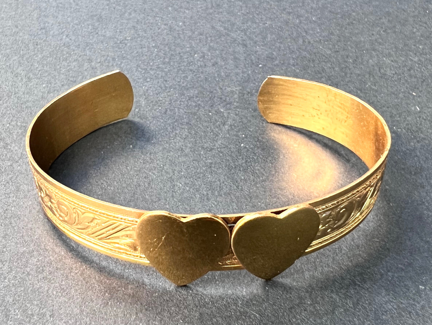 Lovely little kids bracelets, embossed metal bands - swirls and flourishes and flowers - and 2 shiny hearts in the middle.