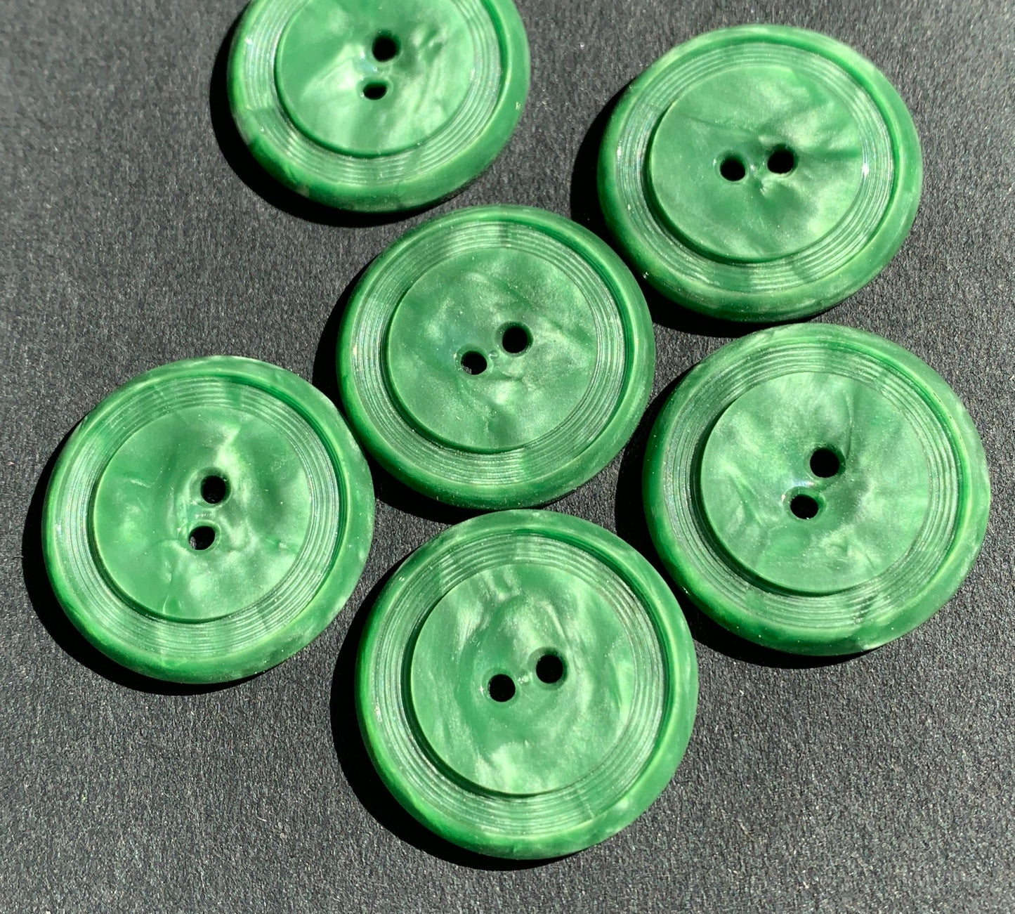 A lovely fern green colour, with lots of depths and variations characteristic of vintage plastic these 2.3cm buttons have concentric circles carved around the rim and a slightly concave centre, which makes the light bounce around to give an exciting shimmer.