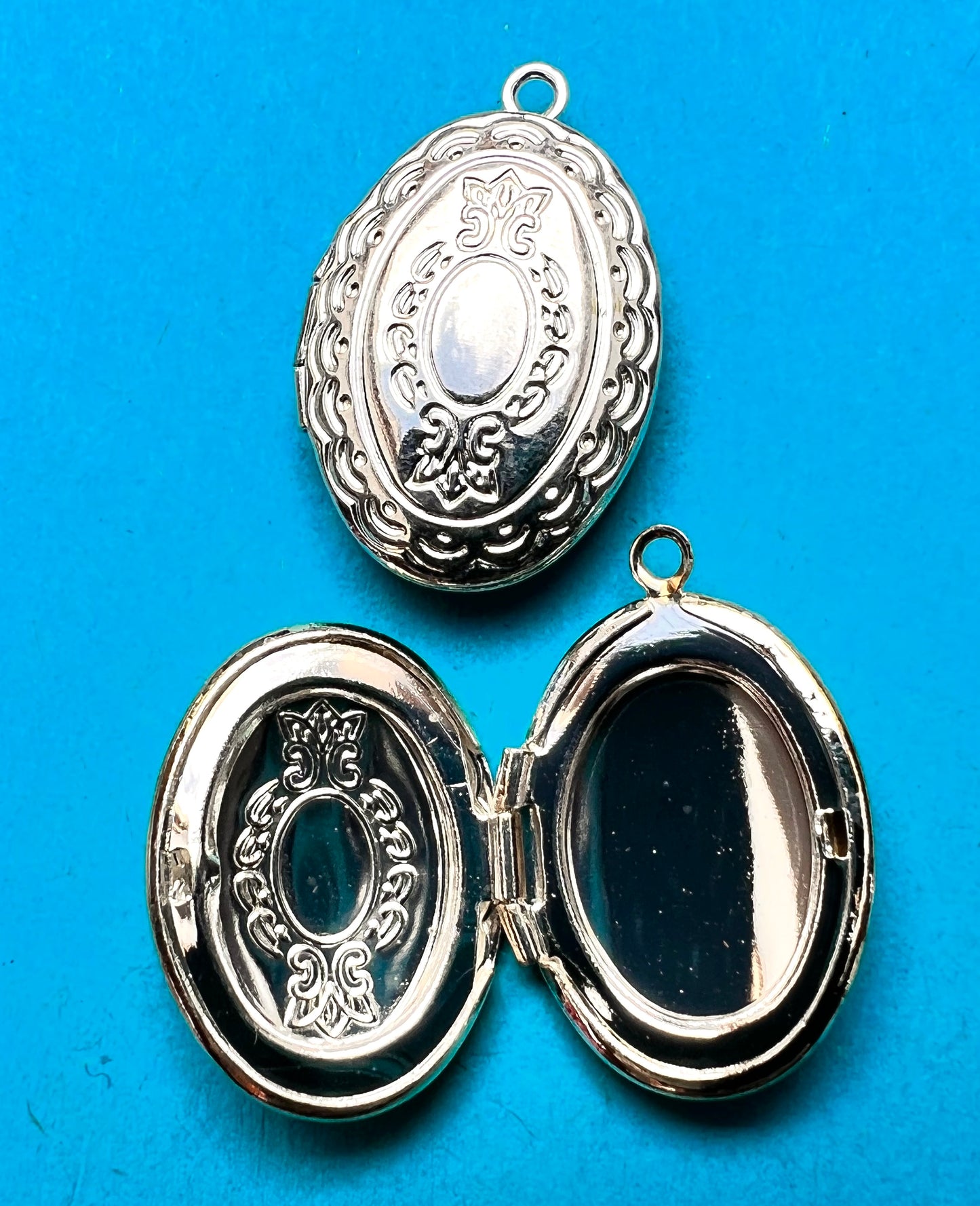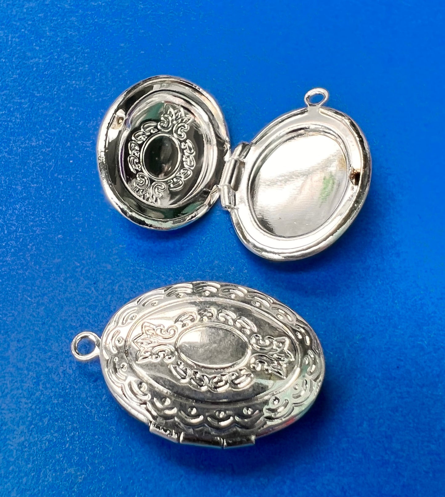 An understated little oval locket, made of a silver tone metal, 2cm tall and opens and closes, with spaces to put pictures.