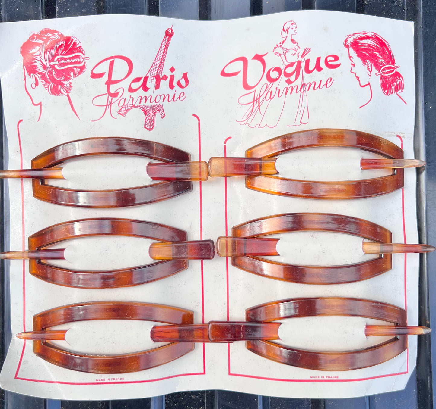 A Vintage 1950s French Sheet of 6 Amber Plastic Hair Barrettes