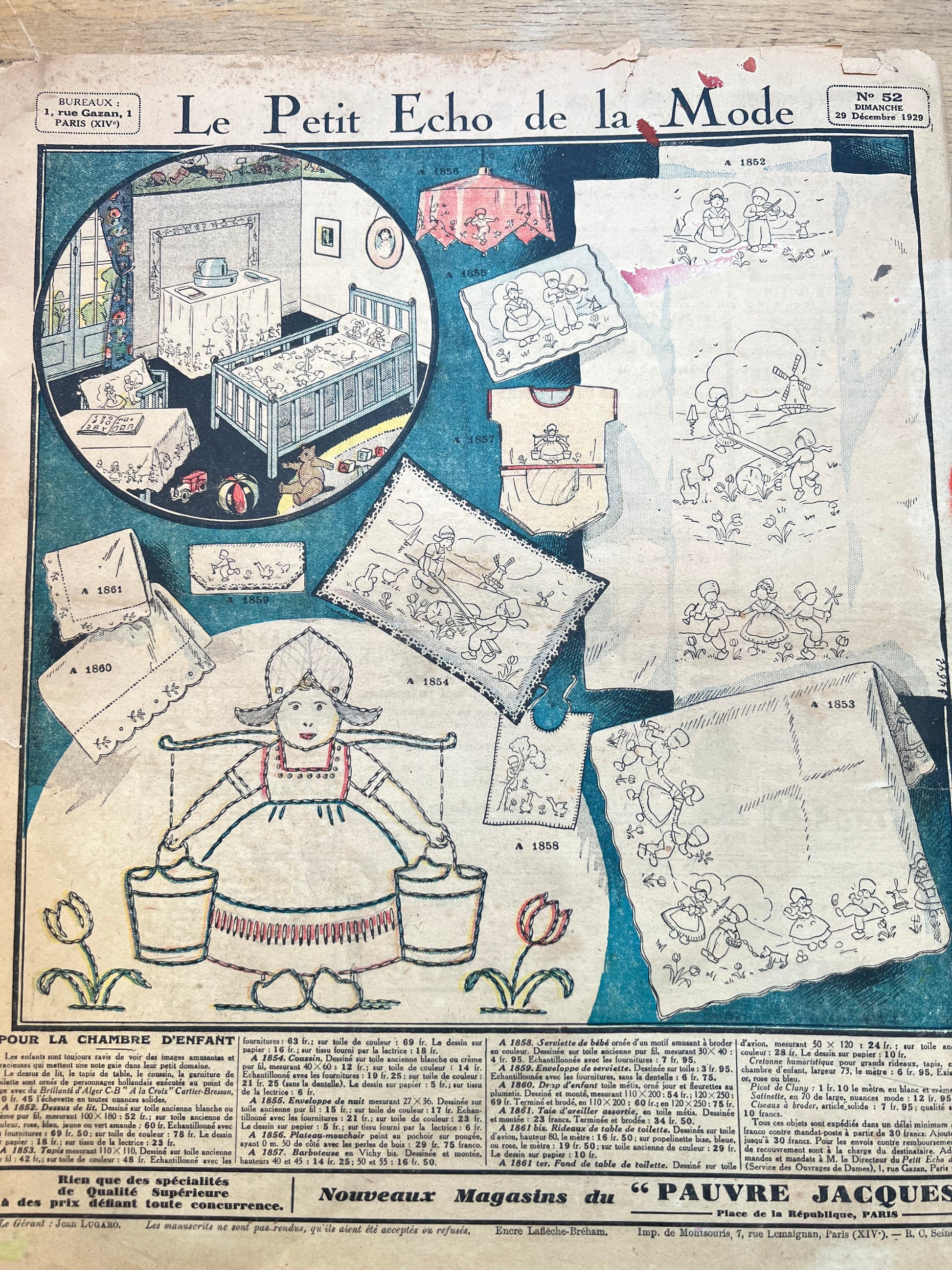 Charming 1920s Christmas Scenes on the cover and double colour centre pages of this 29th December 1929 issue of the French Womens Pape Petit Echo de la Mode.